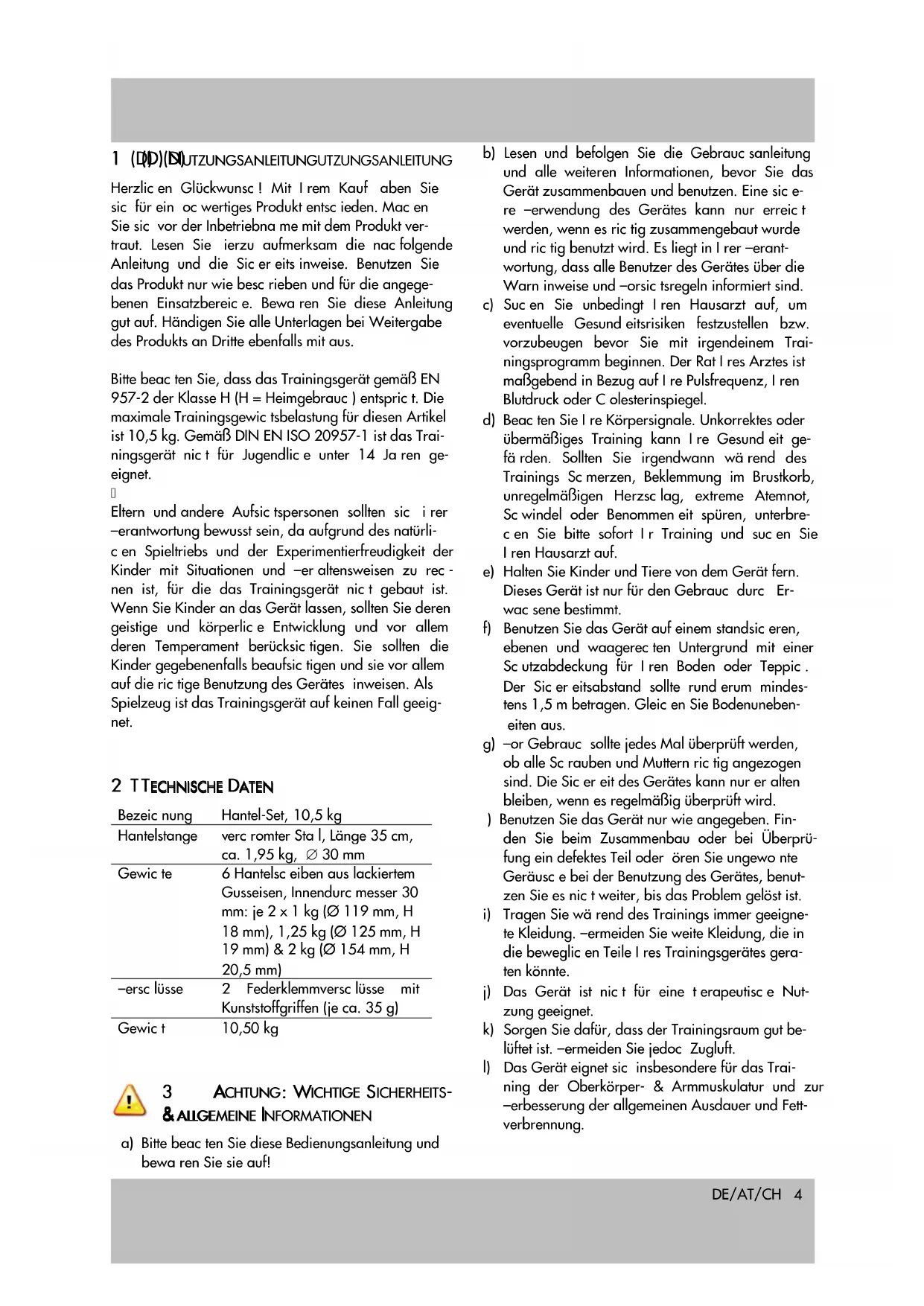 Herzlichen Glückwunsch! Mit Ihrem Kauf haben Sie sich für ein hochwertiges Produkt entschieden. Machen Sie sich vor der Inbetriebnahme mit dem Produkt ver- traut. Lesen Sie hierzu aufmerksam die nachfolgende Anleitung und die Sicherheitshinweise. Benutzen Sie das Produkt nur wie beschrieben und für die angege- benen Einsatzbereiche. Bewahren Sie diese Anleitung gut auf. Händigen Sie alle Unterlagen bei Weitergabe des Produkts an Dritte ebenfalls mit aus. Bitte beachten Sie, dass das Trainingsgerät gemäß EN 957-2 der Klasse H (H = Heimgebrauch) entspricht. Die maximale Trainingsgewichtsbelastung für diesen Artikel ist 10,5 kg. Gemäß DIN EN ISO 20957-1 ist das Trai- ningsgerät nicht für Jugendliche unter 14 Jahren ge- eignet.