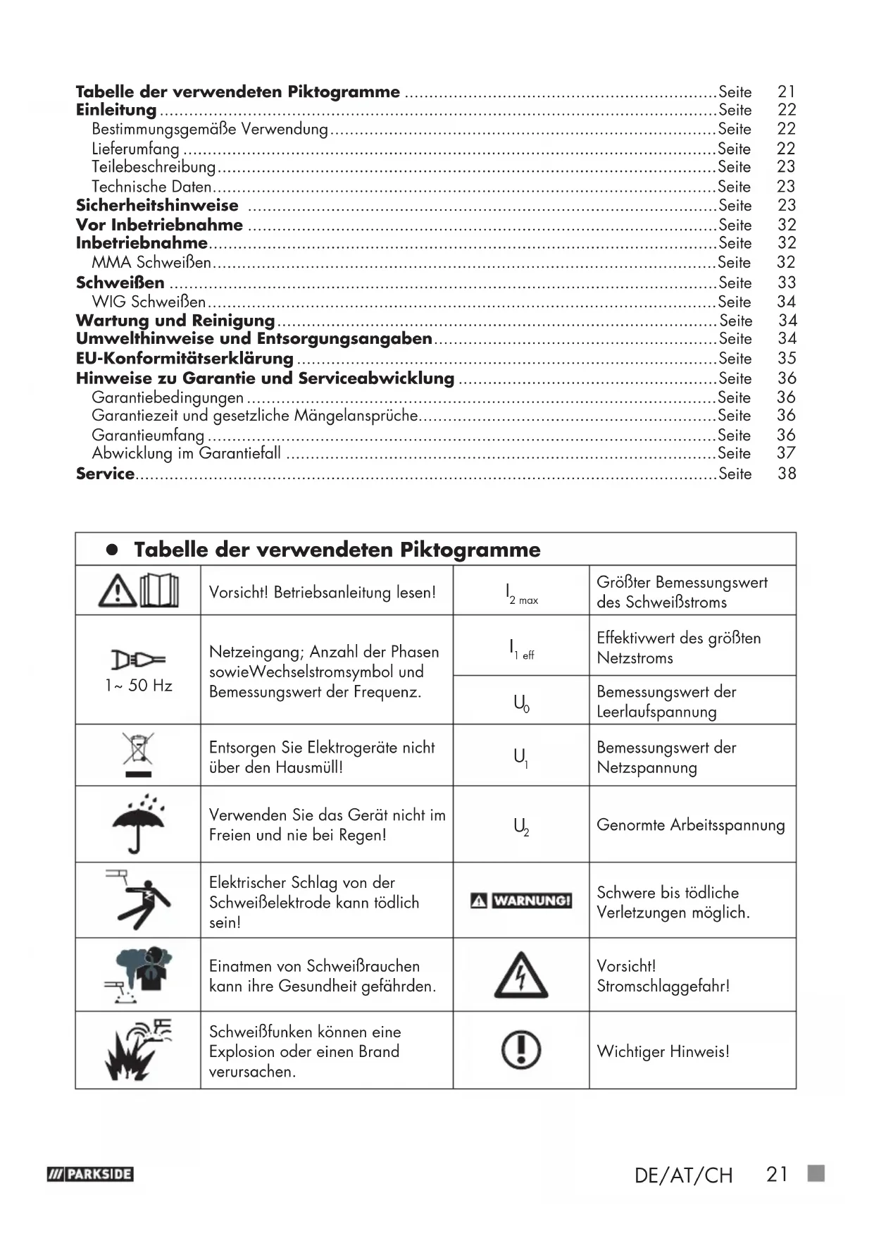 : 70 V Schutzart: IP21S Gewicht: ca. 3 kg Schweißbare Materialstärke: max. 3,0 mm z Sicherheitshinweise Bitte lesen Sie die Gebrauchsanweisung sorgfältig durch und beachten Sie die beschriebenen Hinweise. Machen Sie sich anhand dieser Gebrauchsanweisung mit dem Gerät, dessen richtigem Ge- brauch sowie den Sicherheitshinweisen vertraut. Auf dem Typenschild stehen alle technischen Daten von diesem Schweißgerät, bitte infor- mieren Sie sich über die technischen Gegebenheiten dieses Gerätes. Halten Sie die Verpackungsmaterialien von Kleinkindern fern. Es besteht Erstickungsgefahr! Lassen Sie Reparaturen oder/und Wartungsarbeiten nur von quali- fizierten Elektro-Fachkräften durchführen. Verwenden Sie nur die im Lieferumfang enthaltenen Schweißleitungen. Das Gerät sollte während des Betriebes nicht direkt an der Wand stehen, nicht abgedeckt oder zwischen andere Geräte einge-24 DE/AT/CH klemmt werden, damit immer genügend Luft durch die Lüftungs- schlitze aufgenommen werden kann. Vergewissern Sie sich, dass das Gerät richtig an die Netzspannung angeschlossen ist. Vermei- den Sie jede Zugbeanspruchung der Netzleitung. Ziehen Sie den Netzstecker aus der Steckdose, bevor Sie das Gerät an einem an- deren Ort aufstellen. Wenn das Gerät nicht im Betrieb ist, schalten Sie es immer mittels EIN- / AUS-Schalter aus. Legen Sie den Elektrodenhalter auf einer isolierten Unterlage ab und nehmen Sie erst nach 15 Minuten Ab- kühlung die Elektroden aus dem Halter. Achten Sie auf den Zustand der Schweißkabel, des Elektrodenhal- ters sowie der Masseklemmen. Abnutzungen an der Isolierung und an den stromführenden Teilen können Gefahren hervorrufen und die Qualität der Schweißarbeit mindern. Lichtbogenschweißen erzeugt Funken, geschmolzene Metallteile und Rauch. Beachten Sie daher: Alle brennbaren Substanzen und / oder Materialien vom Arbeitsplatz und dessen unmittelbarer Um- gebung entfernen. Sorgen Sie für eine Belüftung des Arbeitsplatzes. Schweißen Sie nicht auf Behältern, Gefäßen oder Rohren, die brennbare Flüssigkeiten oder Gase enthalten oder enthalten ha- ben. Vermeiden Sie jeden direkten Kontakt mit dem Schweißstromkreis. Die Leerlaufspannung zwischen Elektrodenzan- ge und Masseklemme kann gefährlich sein, es besteht die Gefahr eines elektrischen Schlages. Lagern oder verwenden Sie das Gerät nicht in feuchter oder in nasser Umgebung oder im Regen. Hier gilt die Schutzbestimmung IP21S. Schützen Sie die Augen mit dafür bestimmten Schutzgläsern (DIN Grad 9-10), die Sie auf dem mitgelieferten Schweißschirm befes- tigen. Verwenden Sie Handschuhe und trockene Schutzkleidung, die frei von Öl und Fett ist, um die Haut vor der ultravioletten Strah- lung des Lichtbogens zu schützen. Verwenden Sie die Schweißstromquelle nicht zum Auftauen von Rohren. Beachten Sie: Die Strahlung des Lichtbogens kann die Augen schädigen und Ver- brennungen auf der Haut hervorrufen. Das Lichtbogenschweißen erzeugt Funken und Tropfen von ge-DE/AT/CH