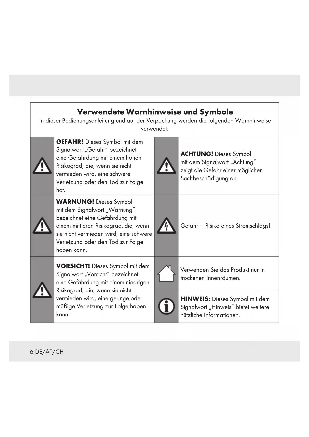 AN DRITTE MIT AUS! Im Falle von Schäden aufgrund der Nichteinhaltung dieser Bedienungsanleitung erlischt Ihr Garantieanspruch! Für Folgeschäden wird keine Haftung übernommen! Im Falle von Sach- oder Personenschäden aufgrund einer unsachgemäßen Benutzung oder Nichteinhaltung der Sicherheitshinweise wird keine Haftung übernommen!10 DE/AT/CH Kinder und Personen mit Einschränkungen