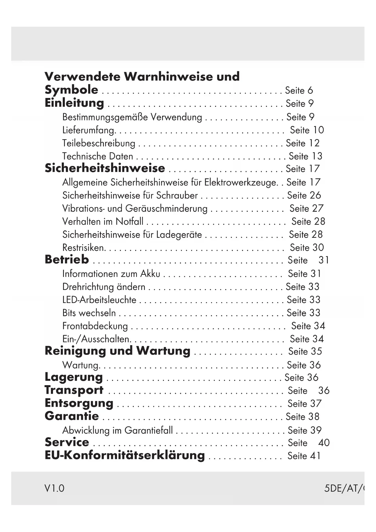 A45DE/AT/CH Verwendete Warnhinweise und Symbole .................................... Seite 6 Einleitung ................................... Seite 9 Bestimmungsgemäße Verwendung ................ Seite 9 Lieferumfang.................................. Seite 10 Teilebeschreibung ............................. Seite 12 Technische Daten .............................. Seite 13 Sicherheitshinweise ....................... Seite 17 Allgemeine Sicherheitshinweise für Elektrowerkzeuge. . Seite 17 Sicherheitshinweise für Schrauber ................. Seite 26 Vibrations- und Geräuschminderung ............... Seite 27 Verhalten im Notfall ............................ Seite 28 Sicherheitshinweise für Ladegeräte ................ Seite 28 Restrisiken.................................... Seite 30 Betrieb ...................................... Seite 31 Informationen zum Akku ........................ Seite 31 Drehrichtung ändern ........................... Seite 33 LED-Arbeitsleuchte ............................. Seite 33 Bits wechseln ................................. Seite 33 Frontabdeckung ............................... Seite 34 Ein-/Ausschalten............................... Seite 34 Reinigung und Wartung .................. Seite 35 Wartung..................................... Seite 36 Lagerung ................................... Seite 36 Transport ................................... Seite 36 Entsorgung ................................. Seite 37 Garantie .................................... Seite 38 Abwicklung im Garantiefall ...................... Seite 39 Service ...................................... Seite 40 EU-Konformitätserklärung ............... Seite 41 V1.06 DE/AT/CH Verwendete Warnhinweise und Symbole In dieser Bedienungsanleitung und auf der Verpackung werden die folgenden Warnhinweise verwendet: GEFAHR! Dieses Symbol mit dem Signalwort „Gefahr“ bezeichnet eine Gefährdung mit einem hohen Risikograd, die, wenn sie nicht vermieden wird, eine schwere Verletzung oder den Tod zur Folge hat. WARNUNG! Dieses Symbol mit dem Signalwort „Warnung“ bezeichnet eine Gefährdung mit einem mittleren Risikograd, die, wenn sie nicht vermieden wird, eine schwere Verletzung oder den Tod zur Folge haben kann. VORSICHT! Dieses Symbol mit dem Signalwort „Vorsicht“ bezeichnet eine Gefährdung mit einem niedrigen Risikograd, die, wenn sie nicht vermieden wird, eine geringe oder mäßige Verletzung zur Folge haben kann. ACHTUNG! Dieses Symbol mit dem Signalwort „Achtung“ zeigt die Gefahr einer möglichen Sachbeschädigung an.7DE/AT/CH HINWEIS: Dieses Symbol mit dem Signalwort „Hinweis“ bietet weitere nützliche Informationen. Gefahr – Risiko eines Stromschlags! Wechselstrom/-spannung Gleichstrom/-spannung Symbol für ein Produkt der Schutzklasse II Verwenden Sie das Produkt nur in trockenen Innenräumen. Dieses Symbol bedeutet, dass bei der Verwendung des Produkts die Betriebsanleitung zu beachten ist.8 DE/AT/CH Li-Ion Lithium-Ionen-Akku
