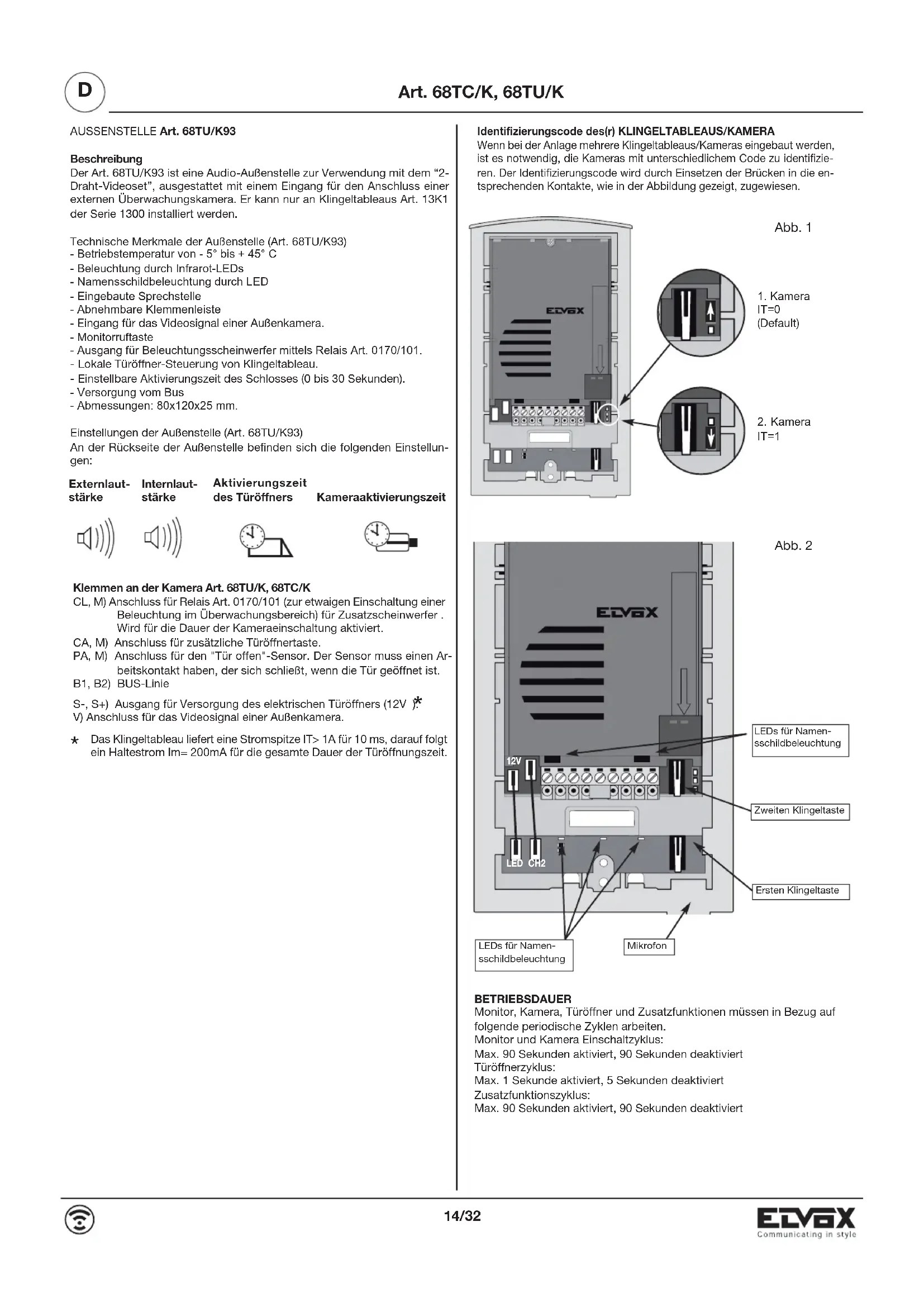 CONNEXION Kit vidéo art. 68IA/R (noir et blanc), Art. 68IA/RC (couleur) - Les deux fils de connexion entre l'alimentation et le moniteur et entre l'alimentation et la plaque peuvent être inversés de polarité. - Le câble conseillé pour la connexion du kit est l'Art. 732H (2X1mm²) et/ou 732I ( 2X1mm²). Si le câble utilisé n'est pas parmi ceux indiqués, les points ci-dessous NE sont PAS garantis . - L'installation est garantie pour une distance maximum de 150 mètres. Di- stance entendue en ligne entre 2 dispositifs, les plus éloignés entre eux (ex. plaque la plus éloignée et moniteur le plus éloigné). Le métrage total du câble tendu ne doit pas dépasser 500 mètres. Ces distances maxi- mums sont valables tant pour les installations en n/b qu'en couleur. - Les gâches électriques reliées aux plaques devront avoir une absorption maximum de 1 A à la tension de 12 Vcc. - Les perturbations ou les décharges électriques peuvent se répercuter sur le fonctionnement correct des équipements. Par conséquent, il est con- seillé de poser les câbles à l'intérieur de tuyauteries séparées. A1 + A2 + B1 + B2 = Max 150 m A1 + A2 + C1 + C2 = Max 150 mD 14/32 Art. 68TC/K, 68TU/K AUSSENSTELLE Art. 68TU/K93BeschreibungDer Art. 68TU/K93 ist eine Audio-Außenstelle zur Verwendung mit dem “2-Draht-Videoset”, ausgestattet mit einem Eingang für den Anschluss einerexternen Überwachungskamera. Er kann nur an Klingeltableaus Art. 13K1der Serie 1300 installiert werden.Technische Merkmale der Außenstelle (Art. 68TU/K93)- Betriebstemperatur von - 5° bis + 45° C - Beleuchtung durch Infrarot-LEDs - Namensschildbeleuchtung durch LED - Eingebaute Sprechstelle - Abnehmbare Klemmenleiste- Eingang für das Videosignal einer Außenkamera.- Monitorruftaste - Ausgang für Beleuchtungsscheinwerfer mittels Relais Art. 0170/101. - Lokale Türöffner-Steuerung von Klingeltableau.- Einstellbare Aktivierungszeit des Schlosses (0 bis 30 Sekunden).- Versorgung vom Bus - Abmessungen: 80x120x25 mm. Einstellungen der Außenstelle (Art. 68TU/K93) An der Rückseite der Außenstelle befinden sich die folgenden Einstellun- gen: Abb. 1 Abb. 2 LED CH2 12V Aktivierungszeitdes TüröffnersKameraaktivierungszeitExternlaut-stärkeInternlaut-stärkeKlemmen an der Kamera Art. 68TU/K, 68TC/KCL, M) Anschluss für Relais Art. 0170/101 (zur etwaigen Einschaltung einerBeleuchtung im Überwachungsbereich) für Zusatzscheinwerfer . Wird für die Dauer der Kameraeinschaltung aktiviert. CA, M) Anschluss für zusätzliche Türöffnertaste. PA, M) Anschluss für den "Tür offen"-Sensor. Der Sensor muss einen Ar-beitskontakt haben, der sich schließt, wenn die Tür geöffnet ist.B1, B2) BUS-Linie S-, S+) Ausgang für Versorgung des elektrischen Türöffners (12V ).V) Anschluss für das Videosignal einer Außenkamera. Das Klingeltableau liefert eine Stromspitze IT> 1A für 10 ms, darauf folgtein Haltestrom Im= 200mA für die gesamte Dauer der Türöffnungszeit. Identifizierungscode des(r) KLINGELTABLEAUS/KAMERA Wenn bei der Anlage mehrere Klingeltableaus/Kameras eingebaut werden,ist es notwendig, die Kameras mit unterschiedlichem Code zu identifizie-ren. Der Identifizierungscode wird durch Einsetzen der Brücken in die en-tsprechenden Kontakte, wie in der Abbildung gezeigt, zugewiesen.1. Kamera IT=0 (Default)2. Kamera IT=1 MikrofonLEDs für Namen-sschildbeleuchtungErsten KlingeltasteZweiten KlingeltasteLEDs für Namen-sschildbeleuchtungBETRIEBSDAUER Monitor, Kamera, Türöffner und Zusatzfunktionen müssen in Bezug auffolgende periodische Zyklen arbeiten. Monitor und Kamera Einschaltzyklus: Max. 90 Sekunden aktiviert, 90 Sekunden deaktiviert Türöffnerzyklus: Max. 1 Sekunde aktiviert, 5 Sekunden deaktiviert Zusatzfunktionszyklus: Max. 90 Sekunden aktiviert, 90 Sekunden deaktiviert15/32