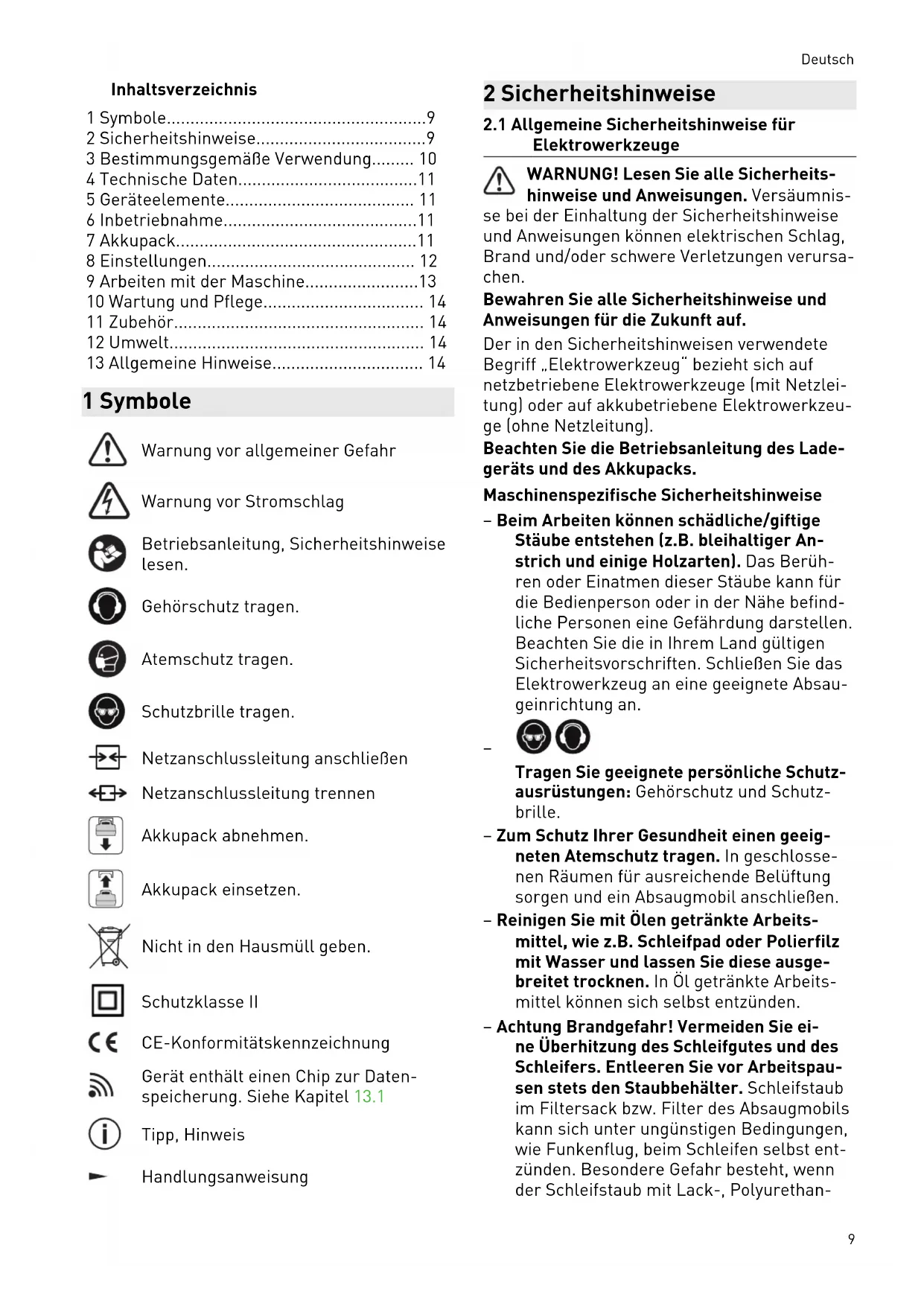 - 13 Allgemeine Hinweise 1 Symbole Warnung vor allgemeiner Gefahr Warnung vor Stromschlag Betriebsanleitung, Sicherheitshinweise lesen. Gehörschutz tragen. Atemschutz tragen. Schutzbrille tragen. Netzanschlussleitung anschließen Netzanschlussleitung trennen Akkupack abnehmen. Akkupack einsetzen. Nicht in den Hausmüll geben. Schutzklasse II CE-Konformitätskennzeichnung Gerät enthält einen Chip zur Daten speicherung. Siehe Kapitel13.1 Tipp, Hinweis Handlungsanweisung 2 Sicherheitshinweise p. 14