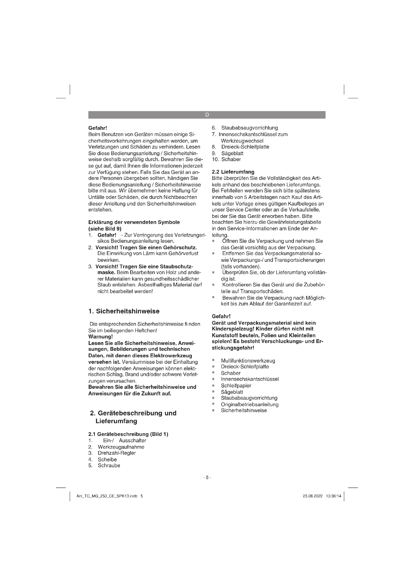 Nur einwandfreie und unbeschädigte Einsatz- werkzeuge verwenden. Anl_TC_MG_250_CE_SPK13.indb 7Anl_TC_MG_250_CE_SPK13.indb 7 25.08.2022 13:36:1625.08.2022 13:36:16D