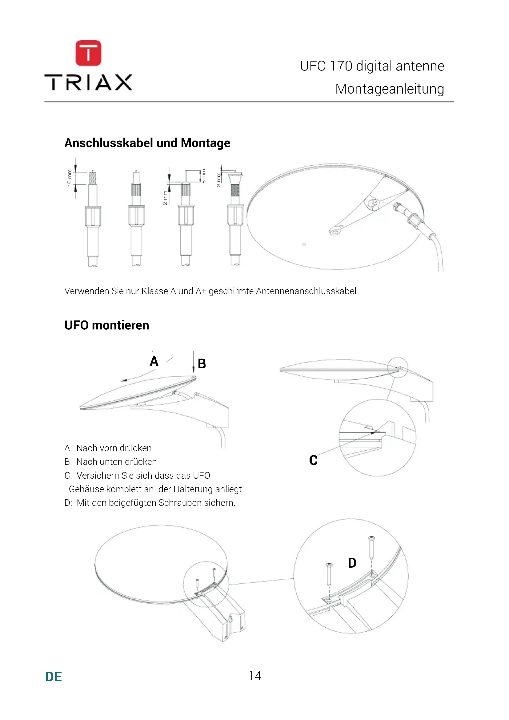Anschlusskabel und Montage 10 mm 2 mm 8 mm 3 mm UFO montieren A: Nach vorn drücken B: Nach unten drücken C: Versichern Sie sich dass das UFO Gehäuse komplett an der Halterung anliegt D: Mit den beigefügten Schrauben sichern. Verwenden Sie nur Klasse A und A+ geschirmte Antennenanschlusskabel