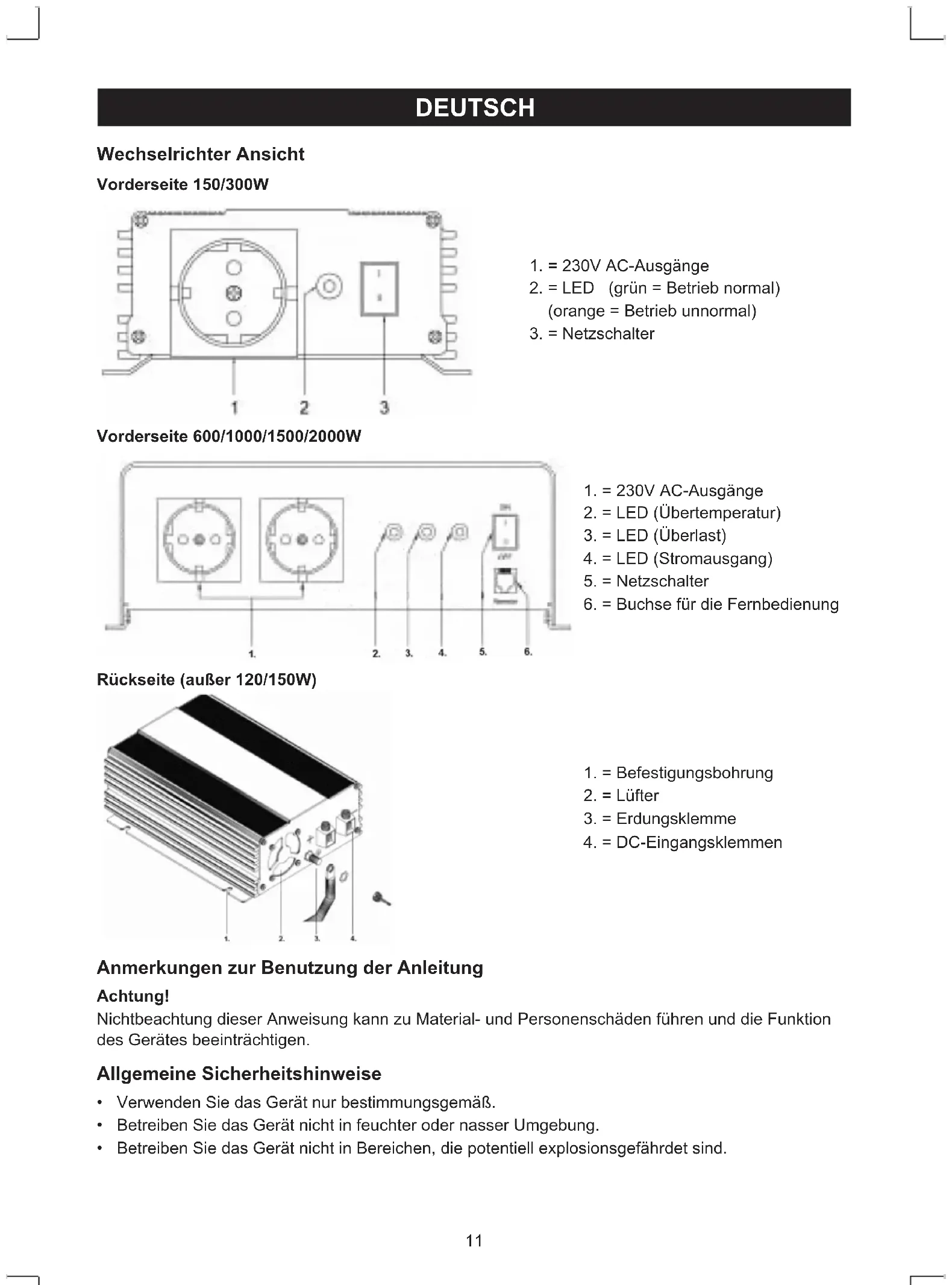 CAUTION11 DEUTSCH Wechselrichter Ansicht Vorderseite 150/300W 1.=230VAC-Ausgänge