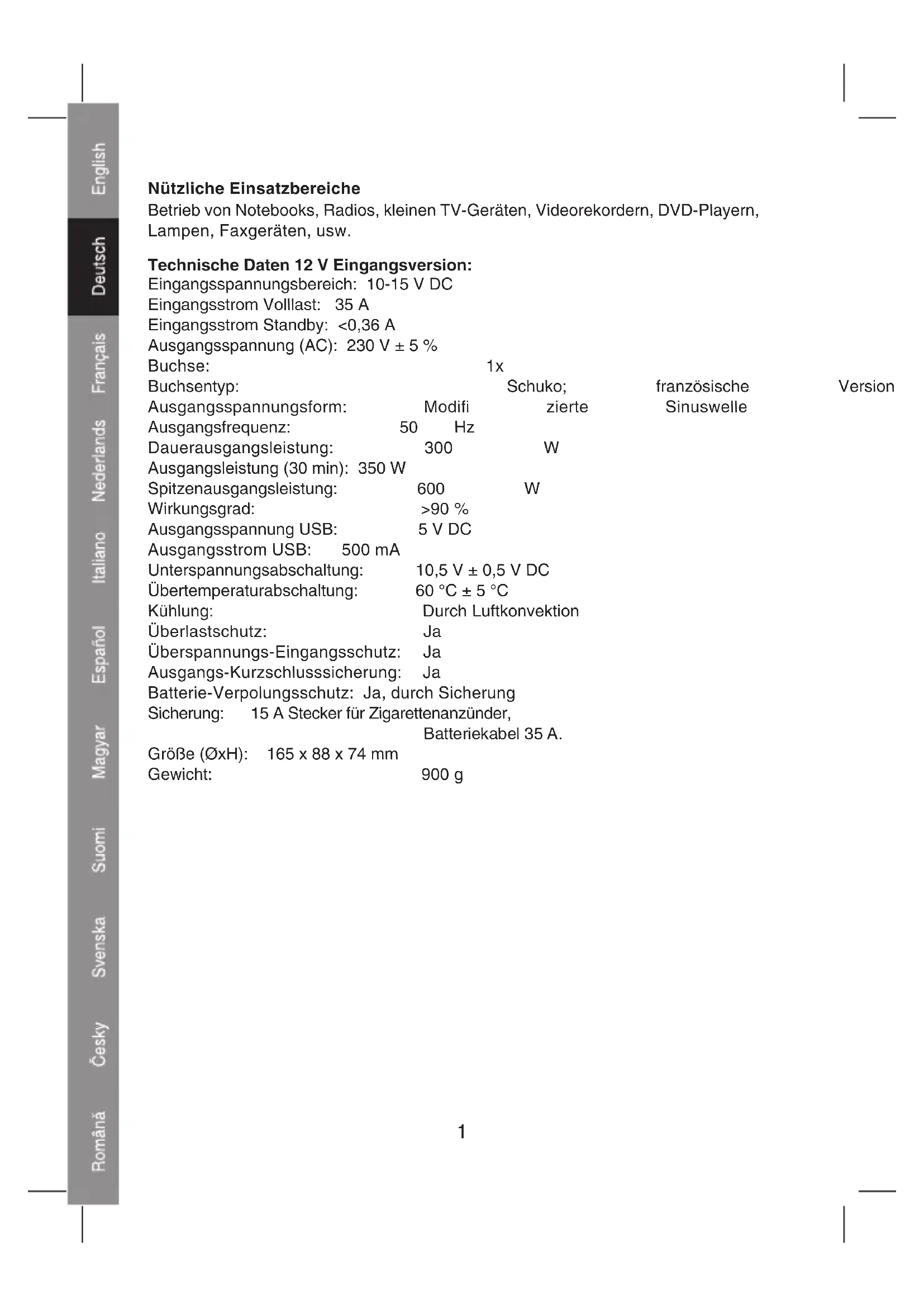 7HQ-INV300WU-12 HQ-INV300WU-24 300 WATT WECHSELRICHTER MIT USB-AUSGANGNützliche Einsatzbereiche Betrieb von Notebooks, Radios, kleinen TV-Geräten, Videorekordern, DVD-Playern, Lampen, Faxgeräten, usw. Technische Daten 12 V Eingangsversion: Eingangsspannungsbereich: 10-15 V DC Eingangsstrom Volllast: 35 A Eingangsstrom Standby: <0,36 A Ausgangsspannung (AC): 230 V ± 5 % Buchse: 1x Buchsentyp: Schuko; französische Version Ausgangsspannungsform: Modifi zierte Sinuswelle Ausgangsfrequenz: 50 Hz Dauerausgangsleistung: 300 W Ausgangsleistung (30 min): 350 W Spitzenausgangsleistung: 600 W Wirkungsgrad: >90 % Ausgangsspannung USB: 5 V DC Ausgangsstrom USB: 500 mA Unterspannungsabschaltung: 10,5 V ± 0,5 V DC Übertemperaturabschaltung: 60 °C ± 5 °C Kühlung: Durch Luftkonvektion Überlastschutz: Ja Überspannungs-Eingangsschutz: Ja Ausgangs-Kurzschlusssicherung: Ja Batterie-Verpolungsschutz: Ja, durch Sicherung Sicherung: 15 A Stecker für Zigarettenanzünder, Batteriekabel 35 A. Größe (ØxH): 165 x 88 x 74 mm Gewicht: 900 g 1Technische Daten 24 V Eingangsversion Eingangsspannungsbereich: 20-30 V DC Eingangsstrom Volllast: 15 A Eingangsstrom Standby: <0,2 A Ausgangsspannung (AC): 230 V ± 5 % Buchse: 1x Buchsentyp: Schuko; französische Version Ausgangsspannungsform: Sinuswelle Ausgangsfrequenz: 50 Hz Dauerausgangsleistung: 300 W Ausgangsleistung (30 Min): 350 W Spitzenausgangsleistung: 600 W Wirkungsgrad: >90 % Ausgangsspannung USB: 5 V DC Ausgangsstrom USB: 500 mA Unterspannungsabschaltung: 21 V ± 0,8 V DC Übertemperaturabschaltung: 60 °C ± 5 °C Kühlung: Durch Luftkonvektion Überlastschutz: Ja Überspannungs-Eingangsschutz: Ja Ausgangs-Kurzschlusssicherung: Ja Batterie-Verpolungsschutz: Ja, durch Sicherung Sicherung: 10 A Stecker für Zigarettenanzünder, Batteriekabel 20 A. Größe (ØxH): 165 x 88 x 74 mm Gewicht: 900 g 2Betriebsanweisung: