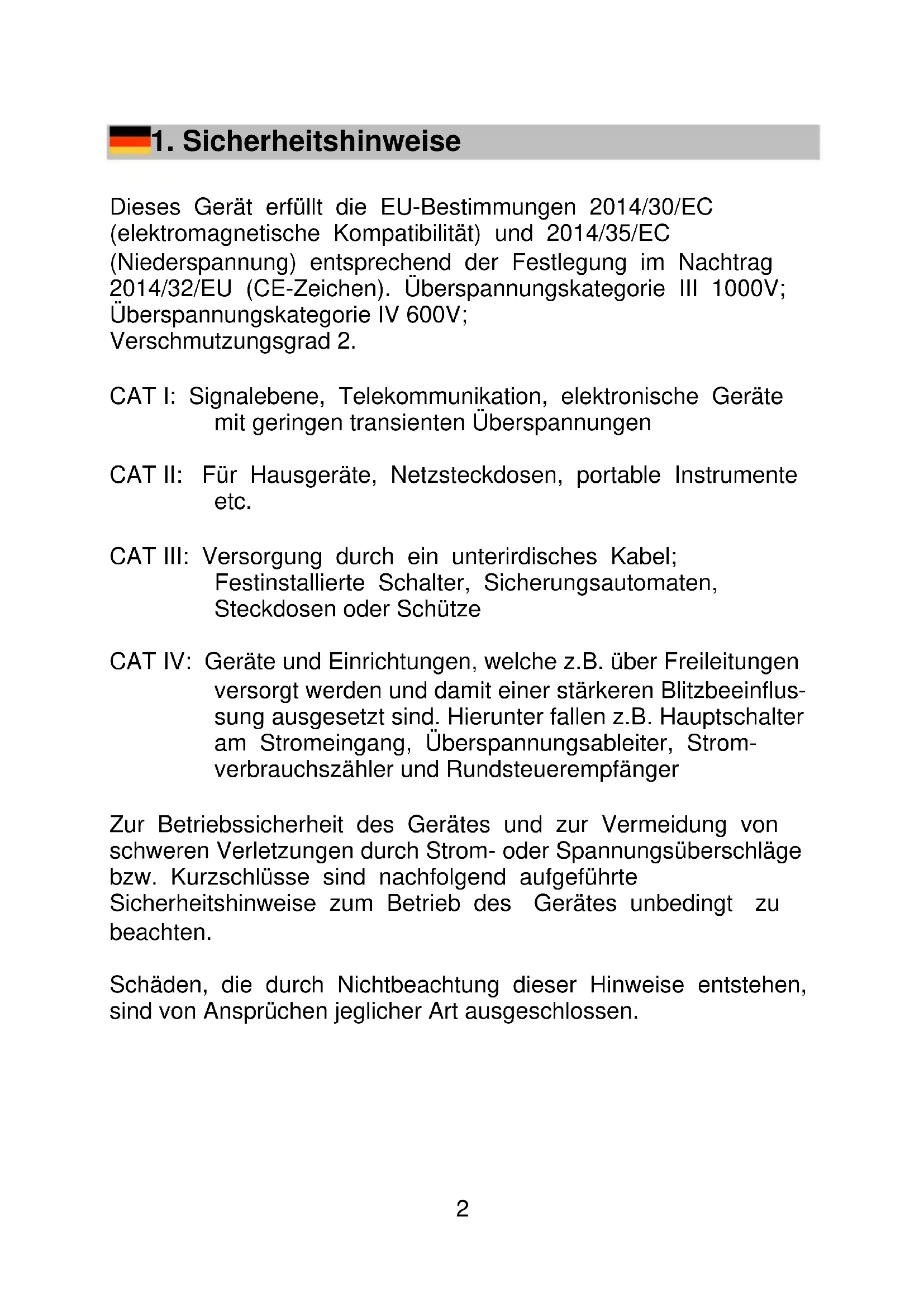 Dieses Gerät erfüllt die EU-Bestimmungen 2014/30/EC (elektromagnetische Kompatibilität) und 2014/35/EC (Niederspannung) entsprechend der Festlegung im Nachtrag 2014/32/EU (CE-Zeichen). Überspannungskategorie III 1000V; Überspannungskategorie IV 600V; Verschmutzungsgrad 2. CAT I: Signalebene, Telekommunikation, elektronische Geräte mit geringen transienten Überspannungen CAT II: Für Hausgeräte, Netzsteckdosen, portable Instrumente etc. CAT III: Versorgung durch ein unterirdisches Kabel; Festinstallierte Schalter, Sicherungsautomaten, Steckdosen oder Schütze CAT IV: Geräte und Einrichtungen, welche z.B. über Freileitungen versorgt werden und damit einer stärkeren Blitzbeeinflus- sung ausgesetzt sind. Hierunter fallen z.B. Hauptschalter am Stromeingang, Überspannungsableiter, Strom- verbrauchszähler und Rundsteuerempfänger Zur Betriebssicherheit des Gerätes und zur Vermeidung von schweren Verletzungen durch Strom- oder Spannungsüberschläge bzw. Kurzschlüsse sind nachfolgend aufgeführte Sicherheitshinweise zum Betrieb des Gerätes unbedingt zu beachten. Schäden, die durch Nichtbeachtung dieser Hinweise entstehen, sind von Ansprüchen jeglicher Art ausgeschlossen.3