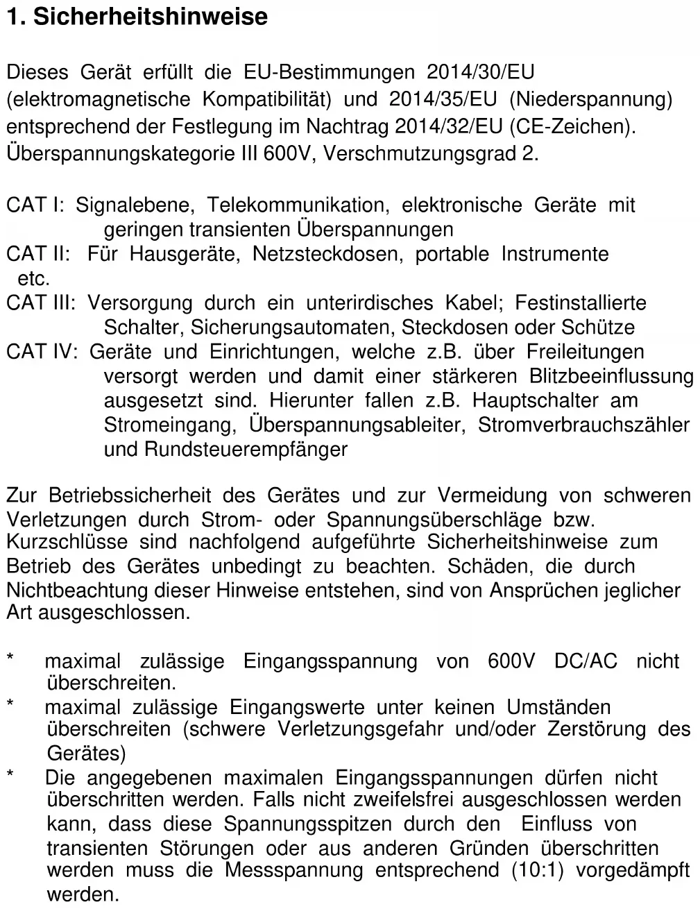 Dieses Gerät erfüllt die EU-Bestimmungen 2014/30/EU (elektromagnetische Kompatibilität) und 2014/35/EU (Niederspannung) entsprechend der Festlegung im Nachtrag 2014/32/EU (CE-Zeichen). Überspannungskategorie III 600V, Verschmutzungsgrad 2. CAT I: Signalebene, Telekommunikation, elektronische Geräte mit geringen transienten Überspannungen CAT II: Für Hausgeräte, Netzsteckdosen, portable Instrumente etc. CAT III: Versorgung durch ein unterirdisches Kabel; Festinstallierte Schalter, Sicherungsautomaten, Steckdosen oder Schütze CAT IV: Geräte und Einrichtungen, welche z.B. über Freileitungen versorgt werden und damit einer stärkeren Blitzbeeinflussung ausgesetzt sind. Hierunter fallen z.B. Hauptschalter am Stromeingang, Überspannungsableiter, Stromverbrauchszähler und Rundsteuerempfänger Zur Betriebssicherheit des Gerätes und zur Vermeidung von schweren Verletzungen durch Strom- oder Spannungsüberschläge bzw. Kurzschlüsse sind nachfolgend aufgeführte Sicherheitshinweise zum Betrieb des Gerätes unbedingt zu beachten. Schäden, die durch Nichtbeachtung dieser Hinweise entstehen, sind von Ansprüchen jeglicher Art ausgeschlossen.
