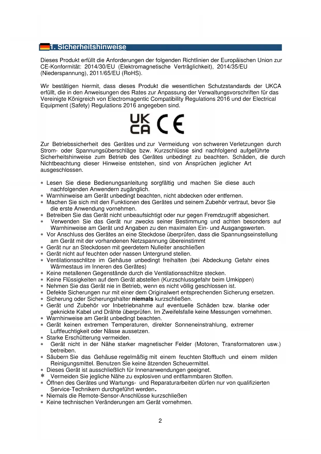 Zur Betriebssicherheit des Gerätes und zur Vermeidung von schweren Verletzungen durch Strom- oder Spannungsüberschläge bzw. Kurzschlüsse sind nachfolgend aufgeführte Sicherheitshinweise zum Betrieb des Gerätes unbedingt zu beachten. Schäden, die durch Nichtbeachtung dieser Hinweise entstehen, sind von Ansprüchen jeglicher Art ausgeschlossen. Lesen Sie diese Bedienungsanleitung sorgfältig und machen Sie diese auch nachfolgenden Anwendern zugänglich. Warnhinweise am Gerät unbedingt beachten, nicht abdecken oder entfernen. Machen Sie sich mit den Funktionen des Gerätes und seinem Zubehör vertraut, bevor Sie die erste Anwendung vornehmen. Betreiben Sie das Gerät nicht unbeaufsichtigt oder nur gegen Fremdzugriff abgesichert. Verwenden Sie das Gerät nur zwecks seiner Bestimmung und achten besonders auf Warnhinweise am Gerät und Angaben zu den maximalen Ein- und Ausgangswerten. Vor Anschluss des Gerätes an eine Steckdose überprüfen, dass die Spannungseinstellung am Gerät mit der vorhandenen Netzspannung übereinstimmt Gerät nur an Steckdosen mit geerdetem Nulleiter anschließen Gerät nicht auf feuchten oder nassen Untergrund stellen. Ventilationsschlitze im Gehäuse unbedingt freihalten (bei Abdeckung Gefahr eines Wärmestaus im Inneren des Gerätes) Keine metallenen Gegenstände durch die Ventilationsschlitze stecken. Keine Flüssigkeiten auf dem Gerät abstellen (Kurzschlussgefahr beim Umkippen) Nehmen Sie das Gerät nie in Betrieb, wenn es nicht völlig geschlossen ist. Defekte Sicherungen nur mit einer dem Originalwert entsprechenden Sicherung ersetzen. Sicherung oder Sicherungshalter niemals kurzschließen. Gerät und Zubehör vor Inbetriebnahme auf eventuelle Schäden bzw. blanke oder geknickte Kabel und Drähte überprüfen. Im Zweifelsfalle keine Messungen vornehmen. Warnhinweise am Gerät unbedingt beachten. Gerät keinen extremen Temperaturen, direkter Sonneneinstrahlung, extremer Luftfeuchtigkeit oder Nässe aussetzen. Starke Erschütterung vermeiden. Gerät nicht in der Nähe starker magnetischer Felder (Motoren, Transformatoren usw.) betreiben. Säubern Sie das Gehäuse regelmäßig mit einem feuchten Stofftuch und einem milden Reinigungsmittel. Benutzen Sie keine ätzenden Scheuermittel. Dieses Gerät ist ausschließlich für Innenanwendungen geeignet. Vermeiden Sie jegliche Nähe zu explosiven und entflammbaren Stoffen. Öffnen des Gerätes und Wartungs- und Reparaturarbeiten dürfen nur von qualifizierten Service-Technikern durchgeführt werden. Niemals die Remote-Sensor-Anschlüsse kurzschließen Keine technischen Veränderungen am Gerät vornehmen.3