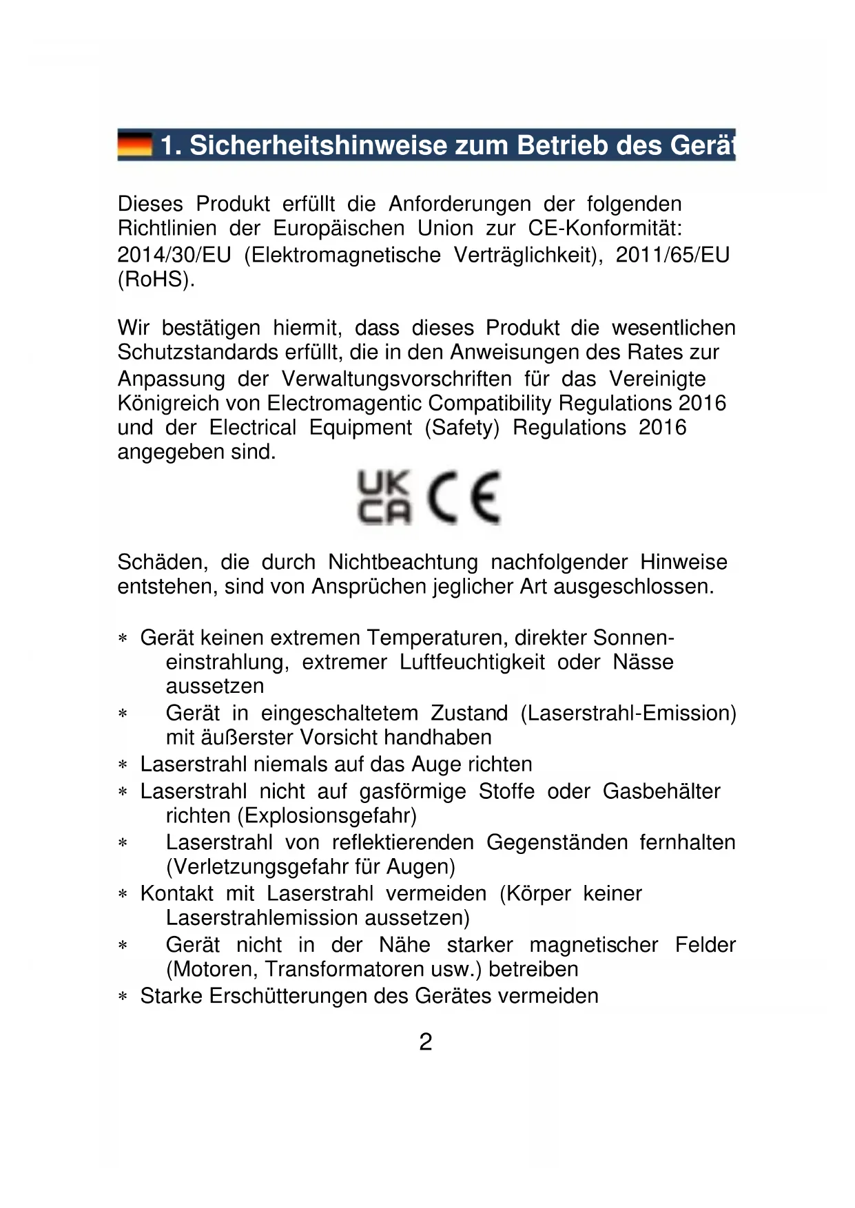 1.1. Laser Klassifizierung Dieses Gerät erzeugt einen sichtbaren Laserstrahl der Laserklasse 2 gemäß EN 60825-1:2014, welcher an der Oberseite des Gerätes austritt. Setzen Sie dieses Gerät nur unter Beachtung der aktuellen Unfallverhütungsvorschriften ein und beachten Sie nachfolgende Sicherheitshinweise. Das Gerät sollte nur mit äußerster Vorsicht gehandhabt, und Körperkontakt mit dem Laser vermieden werden. (Laserstrahlemission) Richten Sie den Laserstrahl nie auf Personen oder Tiere und blicken Sie niemals selbst direkt in den Laser, da es zu schweren Augenschäden führen kann.4 Vermeiden Sie den Einsatz des Lasers auf Augenhöhe und mögliche Reflektionen durch spiegelnde Oberflächen wie Glas und poliertes Metall. Den Laser niemals auf gasförmige Stoffe oder Gasbehälter richten. (Explosionsgefahr) Eine Benutzung darf nur unter Beachtung der jeweiligen gesetzlichen Vorschriften durch qualifiziertes Fachpersonal erfolgen.