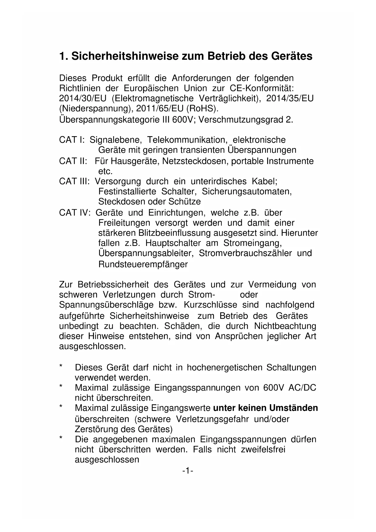 1610 / 1615 / 16251. Sicherheitshinweise zum Betrieb des Gerätes Dieses Produkt erfüllt die Anforderungen der folgenden Richtlinien der Europäischen Union zur CE-Konformität: 2014/30/EU (Elektromagnetische Verträglichkeit), 2014/35/EU (Niederspannung), 2011/65/EU (RoHS). Überspannungskategorie III 600V; Verschmutzungsgrad 2. CAT I: Signalebene, Telekommunikation, elektronische Geräte mit geringen transienten Überspannungen CAT II: Für Hausgeräte, Netzsteckdosen, portable Instrumente etc. CAT III: Versorgung durch ein unterirdisches Kabel; Festinstallierte Schalter, Sicherungsautomaten, Steckdosen oder Schütze CAT IV: Geräte und Einrichtungen, welche z.B. über Freileitungen versorgt werden und damit einer stärkeren Blitzbeeinflussung ausgesetzt sind. Hierunter fallen z.B. Hauptschalter am Stromeingang, Überspannungsableiter, Stromverbrauchszähler und Rundsteuerempfänger Zur Betriebssicherheit des Gerätes und zur Vermeidung von schweren Verletzungen durch Strom- oder Spannungsüberschläge bzw. Kurzschlüsse sind nachfolgend aufgeführte Sicherheitshinweise zum Betrieb des Gerätes unbedingt zu beachten. Schäden, die durch Nichtbeachtung dieser Hinweise entstehen, sind von Ansprüchen jeglicher Art ausgeschlossen.