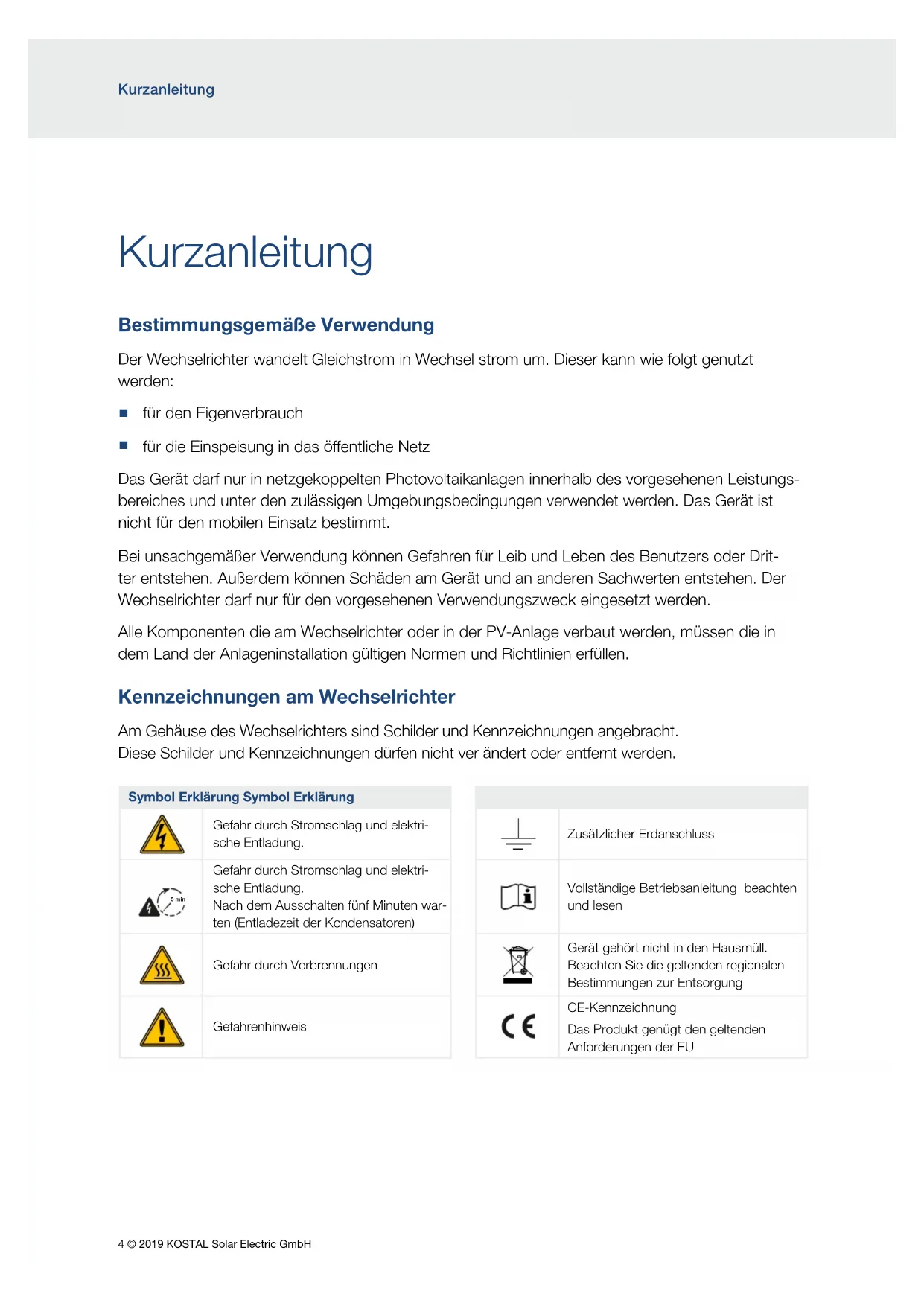 für die Einspeisung in das öentliche Netz Das Gerät darf nur in netzgekoppelten Photovoltaikanlagen innerhalb des vorgesehenen Leistungs- bereiches und unter den zulässigen Umgebungsbedingungen verwendet werden. Das Gerät ist nicht für den mobilen Einsatz bestimmt. Bei unsachgemäßer Verwendung können Gefahren für Leib und Leben des Benutzers oder Drit- ter entstehen. Außerdem können Schäden am Gerät und an anderen Sachwerten entstehen. Der Wechselrichter darf nur für den vorgesehenen Verwendungszweck eingesetzt werden. Alle Komponenten die am Wechselrichter oder in der PV-Anlage verbaut werden, müssen die in dem Land der Anlageninstallation gültigen Normen und Richtlinien erfüllen. Kennzeichnungen am Wechselrichter Am Gehäuse des Wechselrichters sind Schilder und Kennzeichnungen angebracht. Diese Schilder und Kennzeichnungen dürfen nicht ver ändert oder entfernt werden. Symbol Erklärung Symbol Erklärung Gefahr durch Stromschlag und elektri- sche Entladung. Zusätzlicher Erdanschluss 5 min Gefahr durch Stromschlag und elektri- sche Entladung. Nach dem Ausschalten fünf Minuten war- ten (Entladezeit der Kondensatoren) Vollständige Betriebsanleitung beachten und lesen 5 min Gefahr durch Verbrennungen Gerät gehört nicht in den Hausmüll. Beachten Sie die geltenden regionalen Bestimmungen zur Entsorgung Gefahrenhinweis CE-Kennzeichnung Das Produkt genügt den geltenden Anforderungen der EU© 2019 KOSTAL Solar Electric GmbH 5 Kurzanleitung