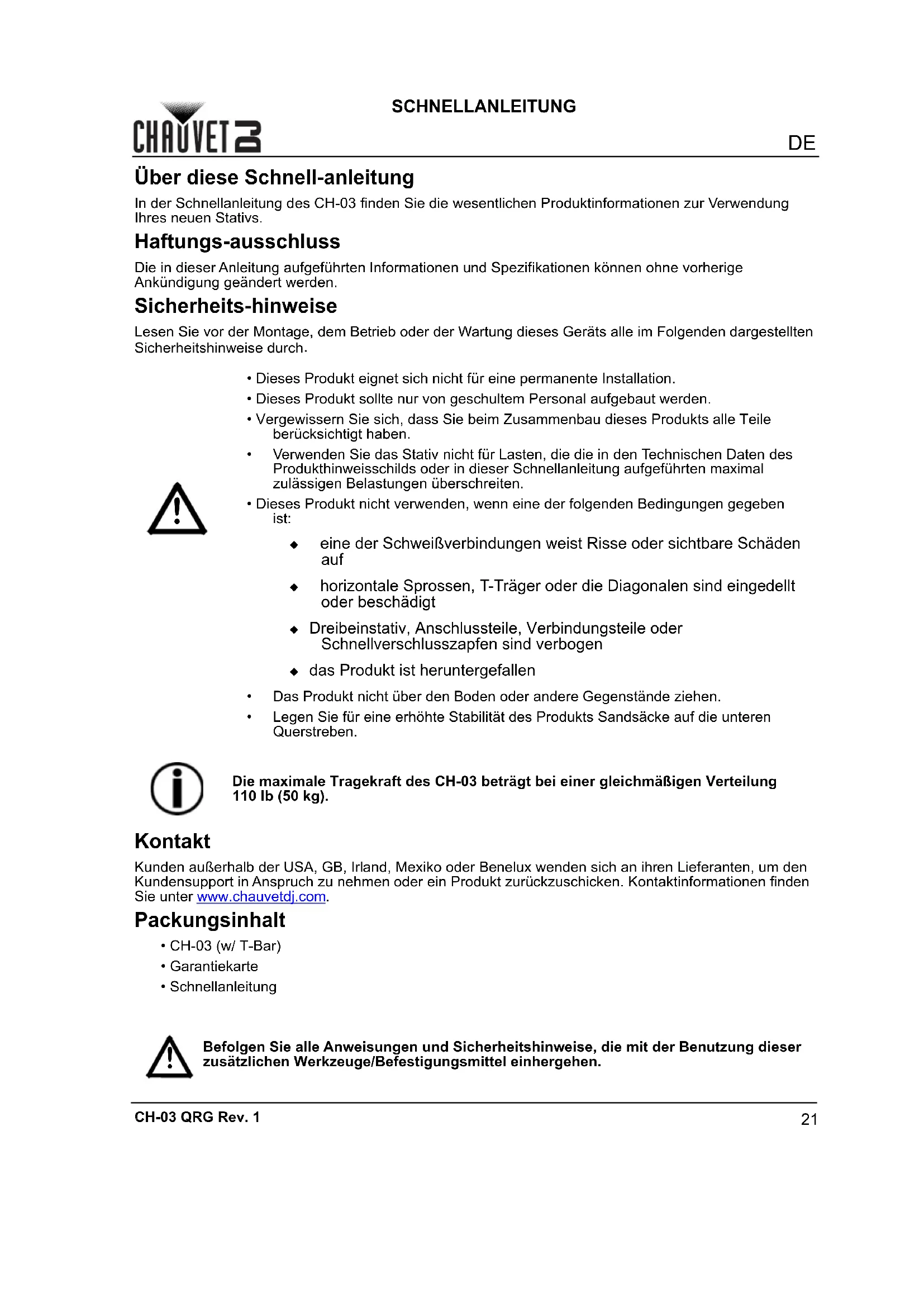 SCHNELLANLEITUNG CH-03 QRG Rev. 1 Start Packen Sie unmittelbar nach Erhalt das Produkt vorsichtig aus. Überprüfen. Sie, ob Sie alle Teile vollständig und unbeschädigt erhalten haben. Wenn die Box oder die in der Verpackung befindlichen Teile beschädigt sind oder Mängel durch nicht einwandfreie Behandlung aufweisen, sichern Sie alle Verpackungsteile und machen dies umgehend beim Transportunternehmen geltend; benachrichtigen Sie jedoch nicht Chauvet. Eine Nichtbeachtung dieser umgehenden Meldepflicht gegenüber dem Transportunternehmen oder fehlende Verpackungsteile bei der Überprüfung des Anspruchs auf Mängelebeseitigung kann zu einem Erlischen dieses Anspruchs führen. Bei anderen Problemen wie etwa fehlende Komponenten oder Teile, Schäden, die nicht durch den Transport entstanden sind, oder nicht offensichtliche Schäden, machen Sie Ihren Anspruch gegenüber Chauvet. Montageanweisun gen Step 1 Step 2 02DE