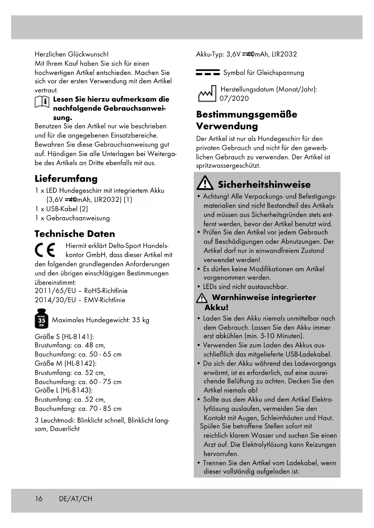 Maximales Hundegewicht: 35 kg Größe S (HL-8141): Brustumfang: ca. 48 cm, Bauchumfang: ca. 50 - 65 cm Größe M (HL-8142): Brustumfang: ca. 52 cm, Bauchumfang: ca. 60 - 75 cm Größe L (HL-8143): Brustumfang: ca. 52 cm, Bauchumfang: ca. 70 - 85 cm 3 Leuchtmodi: Blinklicht schnell, Blinklicht lang- sam, Dauerlicht Akku-Typ: 3,6V 40mAh, LIR2032 Symbol für Gleichspannung Herstellungsdatum (Monat/Jahr): 07/2020 Bestimmungsgemäße Verwendung Der Artikel ist nur als Hundegeschirr für den privaten Gebrauch und nicht für den gewerb- lichen Gebrauch zu verwenden. Der Artikel ist spritzwassergeschützt. Sicherheitshinweise