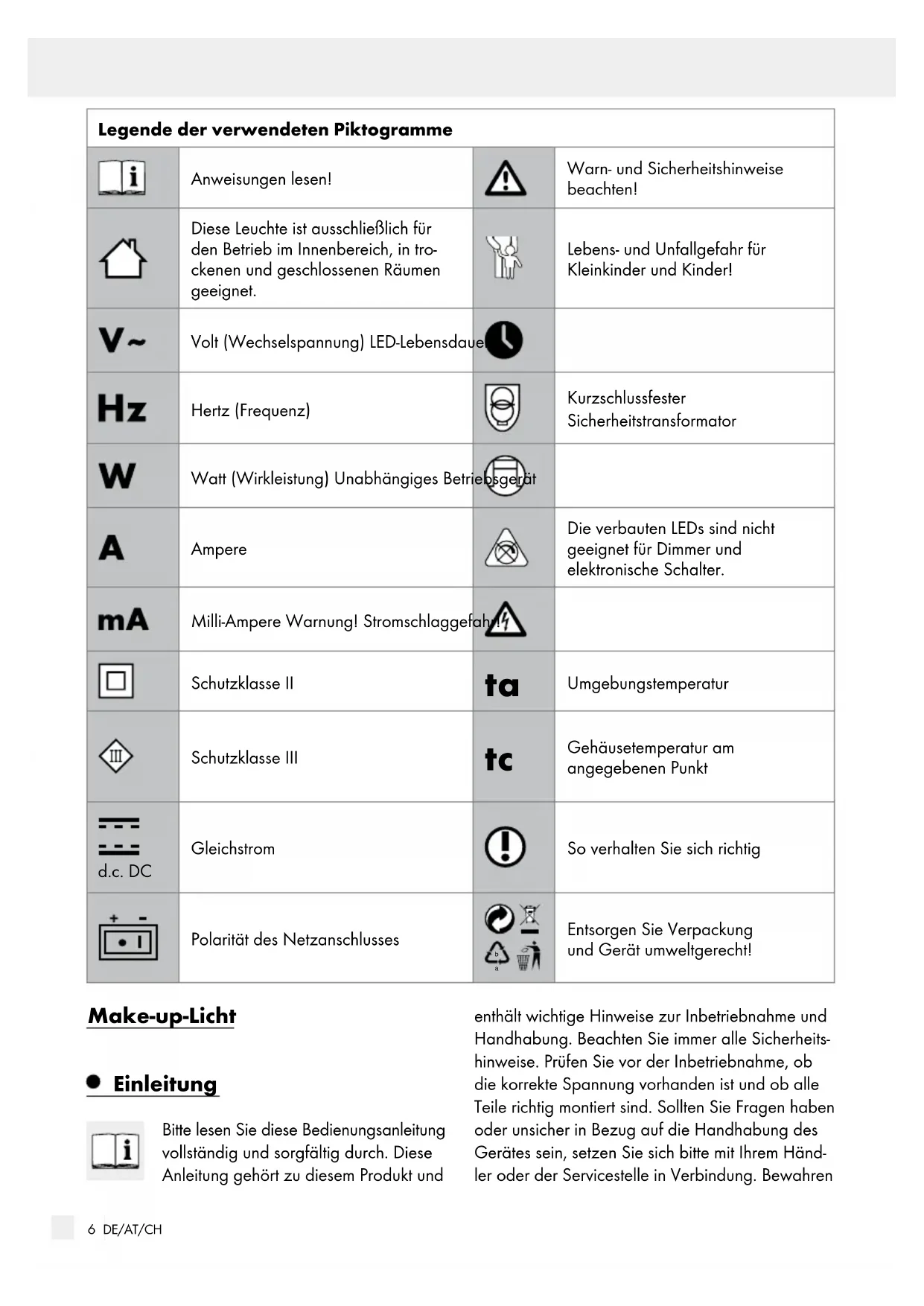Entsorgen Sie Verpackung und Gerät umweltgerecht! Make-up-Licht Einleitung Bitte lesen Sie diese Bedienungsanleitung vollständig und sorgfältig durch. Diese Anleitung gehört zu diesem Produkt und enthält wichtige Hinweise zur Inbetriebnahme und Handhabung. Beachten Sie immer alle Sicherheits- hinweise. Prüfen Sie vor der Inbetriebnahme, ob die korrekte Spannung vorhanden ist und ob alle Teile richtig montiert sind. Sollten Sie Fragen haben oder unsicher in Bezug auf die Handhabung des Gerätes sein, setzen Sie sich bitte mit Ihrem Händ- ler oder der Servicestelle in Verbindung. Bewahren7 DE/AT/CH Einleitung / SicherheitEinleitung Sie diese Anleitung bitte sorgfältig auf und geben Sie sie ggf. an Dritte weiter. Bestimmungsgemäße Verwendung Diese Leuchte ist ausschließlich für den Betrieb im Innenbereich, in trockenen und geschlossenen Räumen geeignet. Dieses Gerät ist nur für den Einsatz in privaten Haus- halten und nicht für den kommerziellen Gebrauch vorgesehen. Eine andere Verwendung als zuvor beschrieben ist nicht zulässig und führt zur Beschä- digung dieses Produktes. Darüber hinaus ist dies mit Gefahren, wie z. B. Kurzschluss, Brand elektrischem Schlag etc. verbunden. Lieferumfang Kontrollieren Sie unmittelbar nach dem Auspacken immer den Lieferumfang auf Vollständigkeit sowie den einwandfreien Zustand des Gerätes. 1 Make-up-Licht 2 Saugnäpfe 1 Bedienungsanleitung Teilebeschreibung