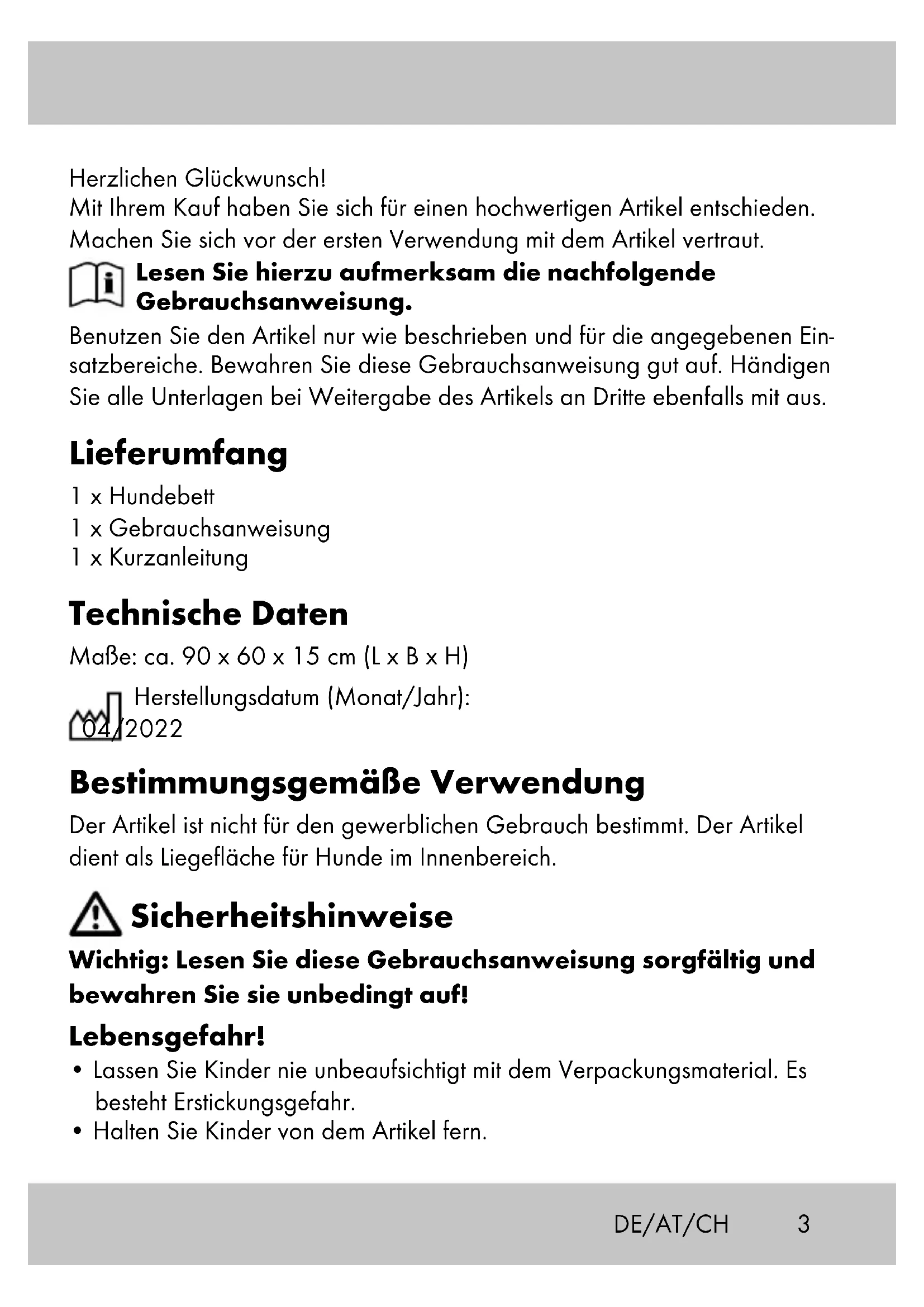 Herzlichen Glückwunsch! Mit Ihrem Kauf haben Sie sich für einen hochwertigen Artikel entschieden. Machen Sie sich vor der ersten Verwendung mit dem Artikel vertraut. Lesen Sie hierzu aufmerksam die nachfolgende Gebrauchsanweisung. Benutzen Sie den Artikel nur wie beschrieben und für die angegebenen Ein- satzbereiche. Bewahren Sie diese Gebrauchsanweisung gut auf. Händigen Sie alle Unterlagen bei Weitergabe des Artikels an Dritte ebenfalls mit aus. Lieferumfang 1 x Hundebett 1 x Gebrauchsanweisung 1 x Kurzanleitung Technische Daten Maße: ca. 90 x 60 x 15 cm (L x B x H) Herstellungsdatum (Monat/Jahr): 04/2022 Bestimmungsgemäße Verwendung Der Artikel ist nicht für den gewerblichen Gebrauch bestimmt. Der Artikel dient als Liegefläche für Hunde im Innenbereich. Sicherheitshinweise Wichtig: Lesen Sie diese Gebrauchsanweisung sorgfältig und bewahren Sie sie unbedingt auf! Lebensgefahr!