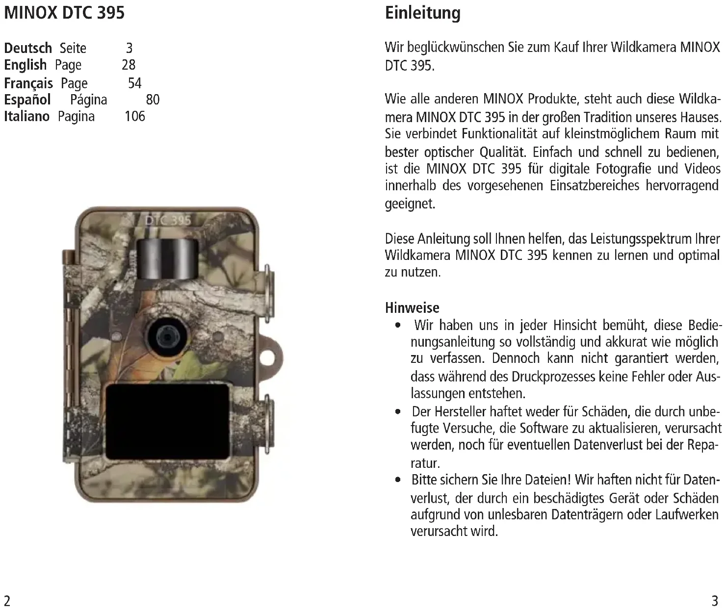 DTC 395 Wildkamera Wildlife camera Caméra de surveillance Cámara de caza Fototrappola Bedienungsanleitung Instructions Mode d’emploi Manual de instrucciones Istruzione d’uso2 3 Einleitung Wir beglückwünschen Sie zum Kauf Ihrer Wildkamera MINOX DTC 395. Wie alle anderen MINOX Produkte, steht auch diese Wildka- mera MINOX DTC 395 in der großen Tradition unseres Hauses. Sie verbindet Funktionalität auf kleinstmöglichem Raum mit bester optischer Qualität. Einfach und schnell zu bedienen, ist die MINOX DTC 395 für digitale Fotografie und Videos innerhalb des vorgesehenen Einsatzbereiches hervorragend geeignet. Diese Anleitung soll Ihnen helfen, das Leistungsspektrum Ihrer Wildkamera MINOX DTC 395 kennen zu lernen und optimal zu nutzen. Hinweise