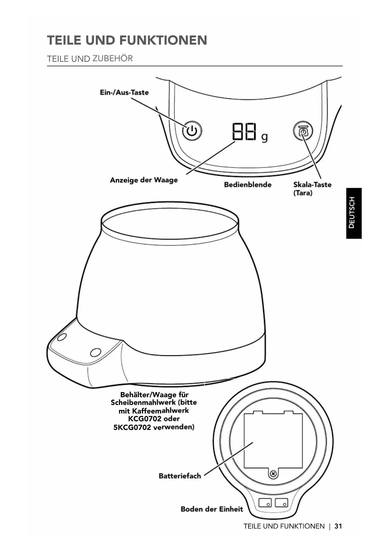 Behälter/Waage für Scheibenmahlwerk (bitte mit Kaffeemahlwerk KCG0702 oder 5KCG0702 verwenden) Batteriefach Bedienblende Boden der Einheit Ein-/Aus-Taste Anzeige der Waage Skala-Taste (Tara)32 | BEHÄLTER/WAAGE FÜR SCHEIBENMAHLWERK - SICHERHEIT