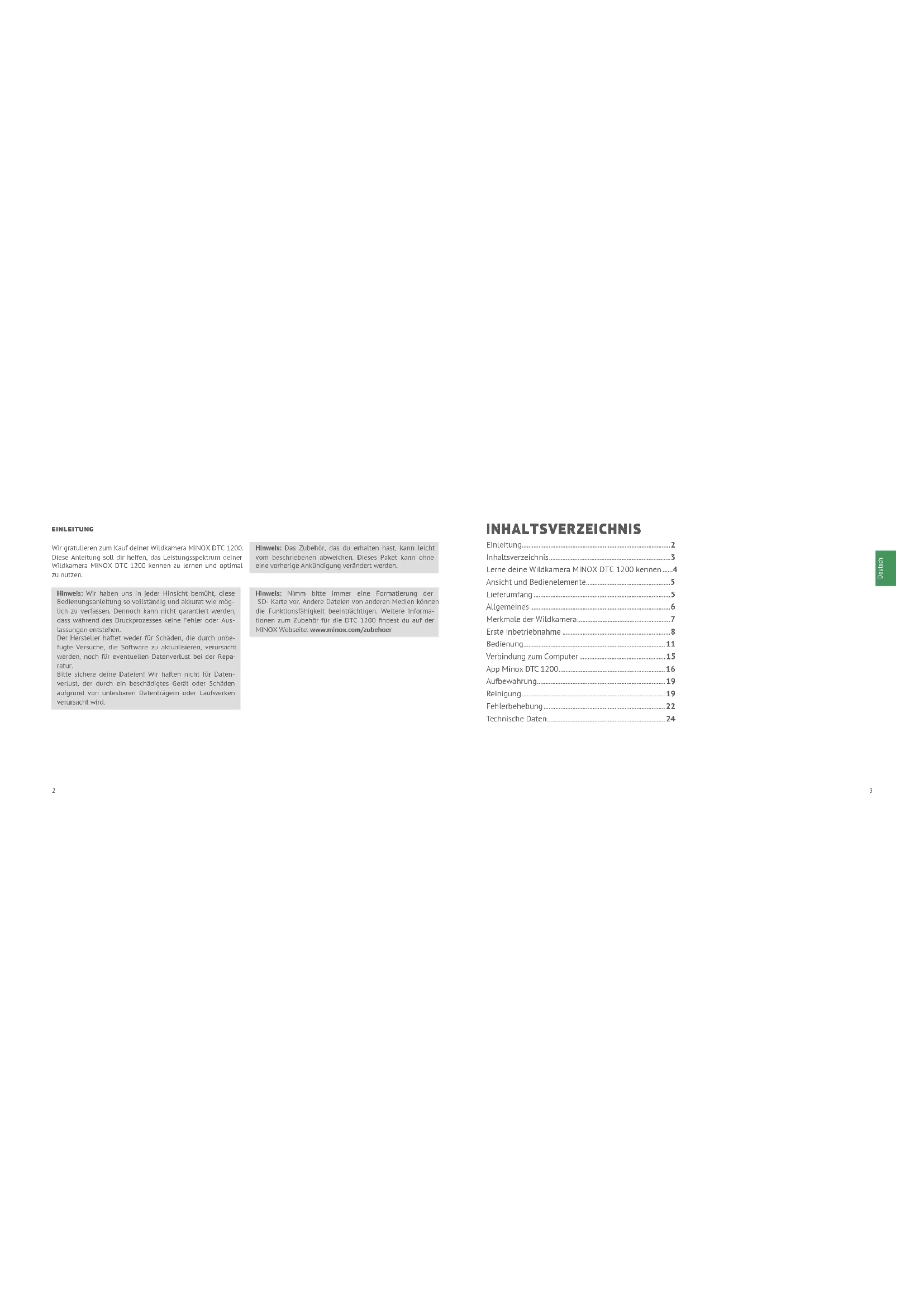 - EINLEITUNG Wir gratulieren zum Kauf deiner Wildkamera MINOX DTC 1200. Diese Anleitung soll dir helfen, das Leistungsspektrum deiner Wildkamera MINOX DTC 1200 kennen zu lernen und optimal zu nutzen. Hinweis: Wir haben uns in jeder Hinsicht bemüht, diese Bedienungsanleitung so vollständig und akkurat wie mög- lich zu verfassen. Dennoch kann nicht garantiert werden, dass während des Druckprozesses keine Fehler oder Aus- lassungen entstehen. Der Hersteller haftet weder für Schäden, die durch unbe- fugte Versuche, die Software zu aktualisieren, verursacht werden, noch für eventuellen Datenverlust bei der Repa- ratur. Bitte sichere deine Dateien! Wir haften nicht für Daten- verlust, der durch ein beschädigtes Gerät oder Schäden aufgrund von unlesbaren Datenträgern oder Laufwerken verursacht wird. Hinweis: Das Zubehör, das du erhalten hast, kann leicht vom beschriebenen abweichen. Dieses Paket kann ohne eine vorherige Ankündigung verändert werden. Hinweis: Nimm bitte immer eine Formatierung der SD- Karte vor. Andere Dateien von anderen Medien können die Funktionsfähigkeit beeinträchtigen. Weitere Informa- tionen zum Zubehör für die DTC 1200 findest du auf der MINOX Webseite: www.minox.com/zubehoer INHALTSVERZEICHNIS Einleitung p. 2