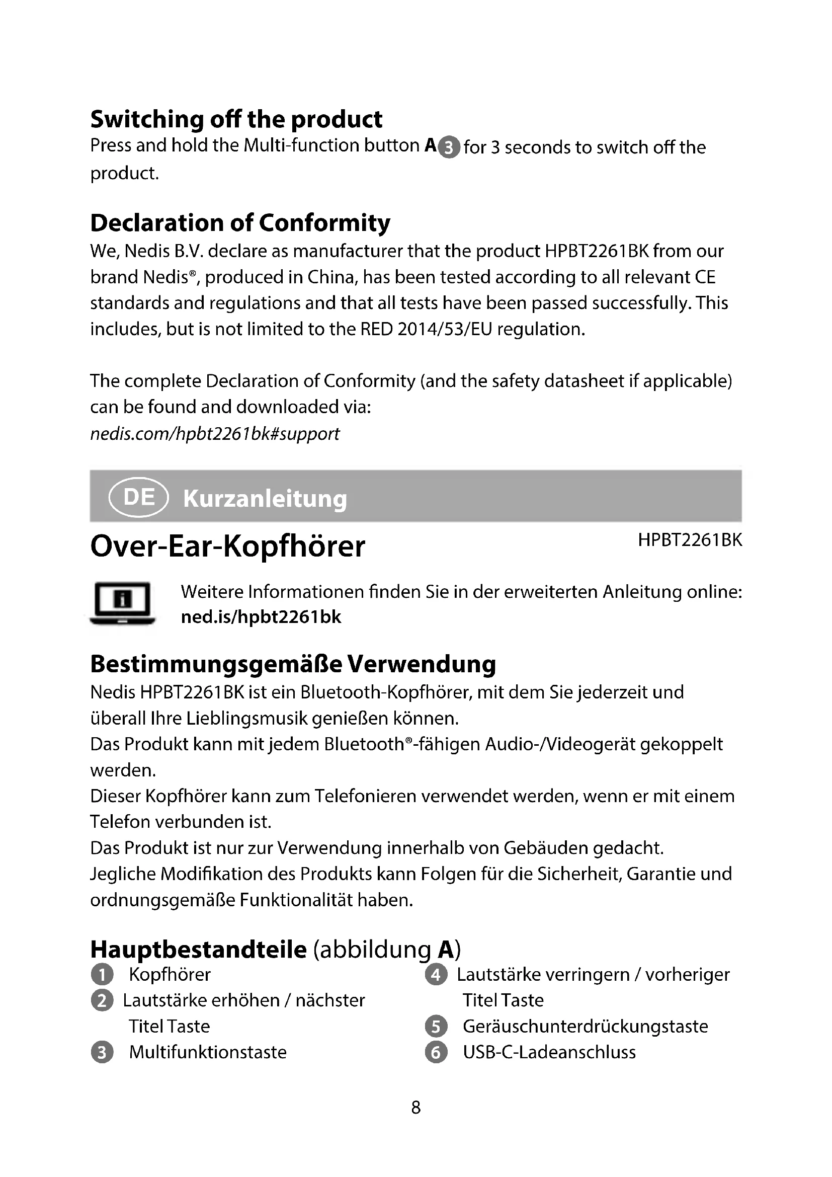 3Sekunden lang gedrückt, um das Produkt auszuschalten.12 Konformitätserklärung Wir, Nedis B.V., erklären als Hersteller, dass das Produkt HPBT2261BK unserer Marke Nedis®, produziert in China, nach allen geltenden CE-Standards und Vorschriften getestet wurde und alle diese Tests erfolgreich bestanden hat. Dies gilt unter anderem auch für die Richtlinie RED 2014/53/EU. Die vollständige Konformitätserklärung (und das Sicherheitsdatenblatt, falls zutreend) steht zum Download zur Verfügung unter: nedis.de/hpbt2261bk#support