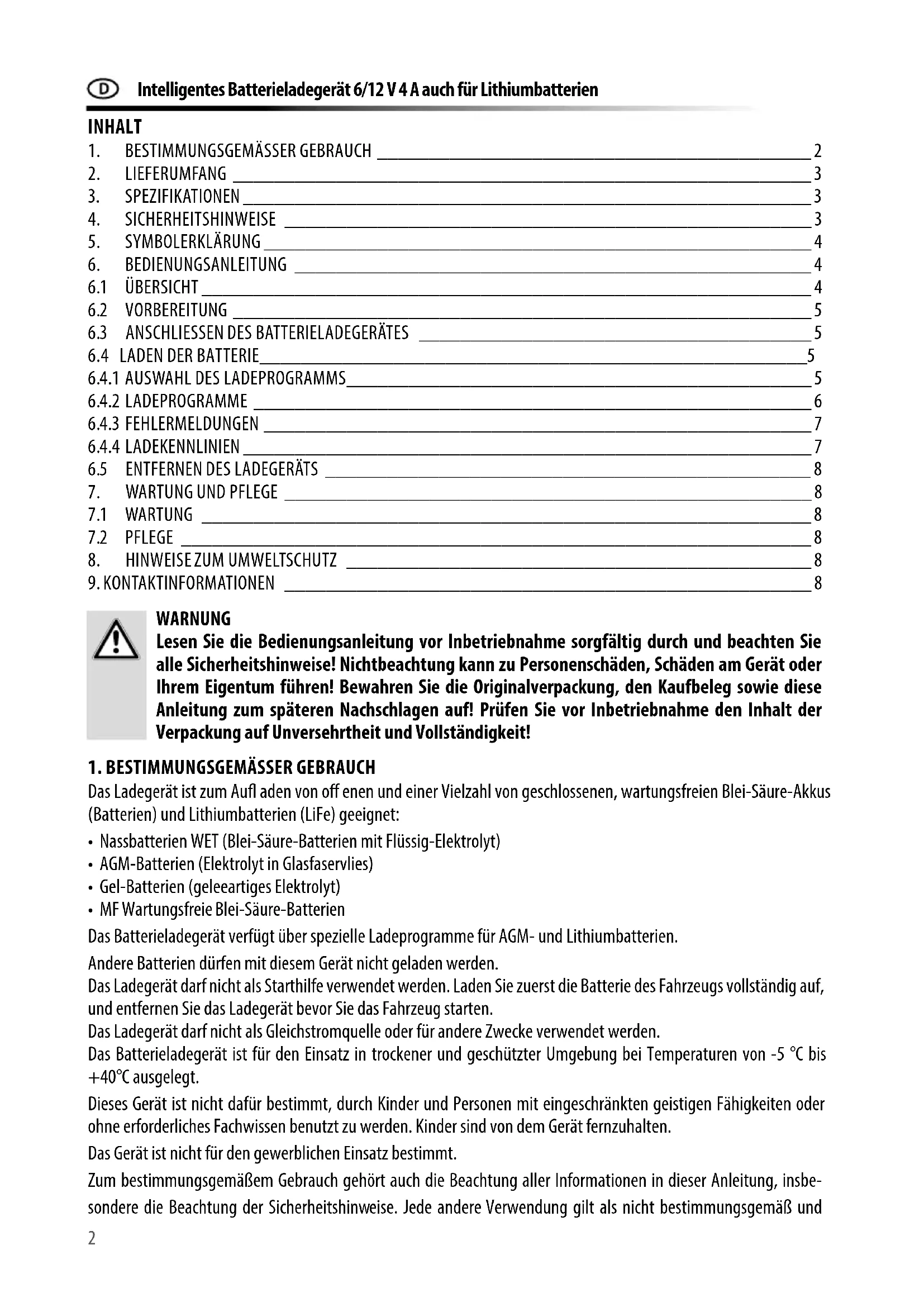 - Art.-Nr.: 16647 Intelligentes Batterieladegerät 6/12 V 4 A auch für Lithiumbatterien Bedienungsanleitung p. 2