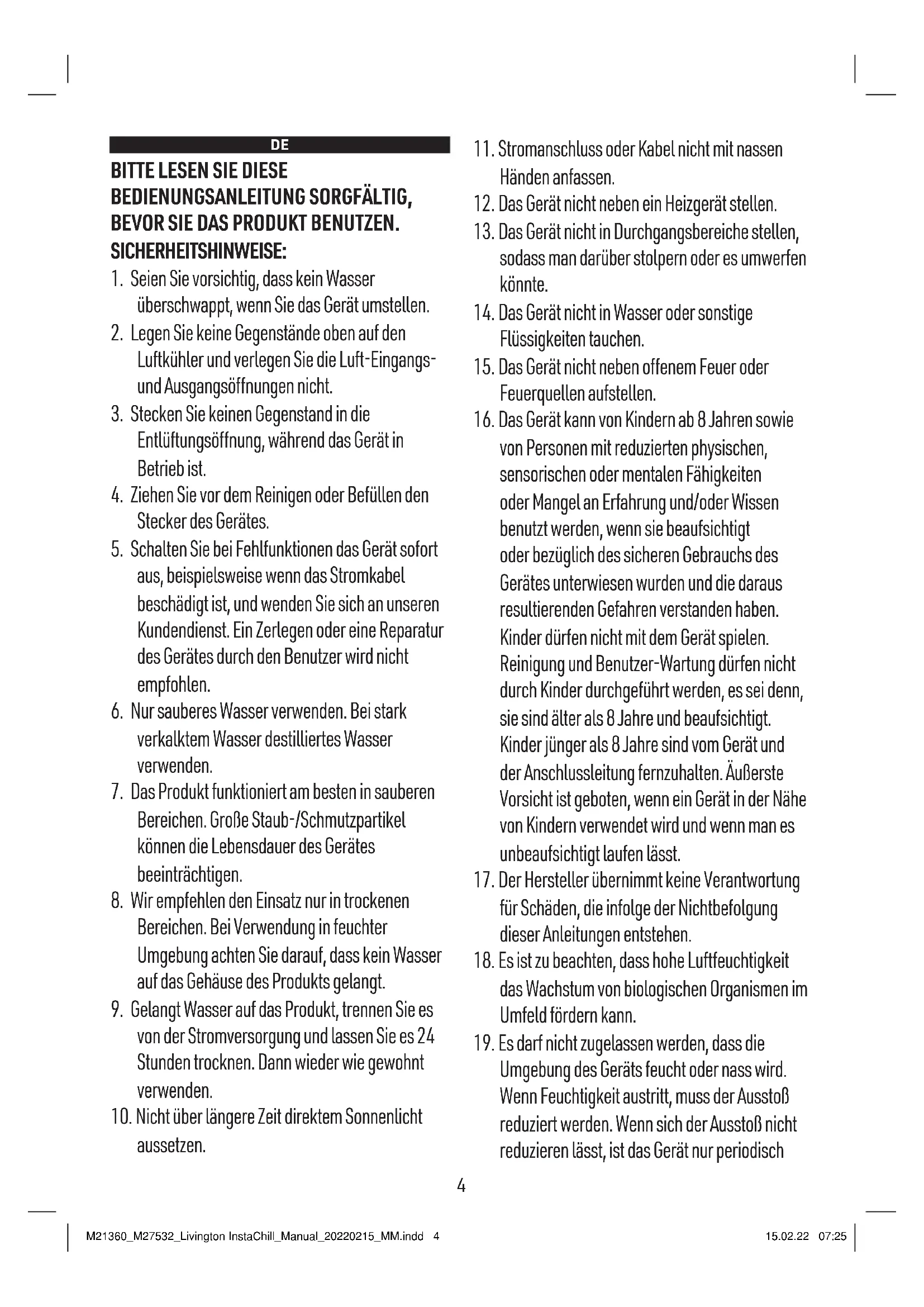 Umgebung des Geräts feucht oder nass wird. Wenn Feuchtigkeit austritt, muss der Ausstoß reduziert werden. Wenn sich der Ausstoß nicht reduzieren lässt, ist das Gerät nur periodisch M21360_M27532_Livington InstaChill_Manual_20220215_MM.indd 4M21360_M27532_Livington InstaChill_Manual_20220215_MM.indd 4 15.02.22 07:2515.02.22 07:254