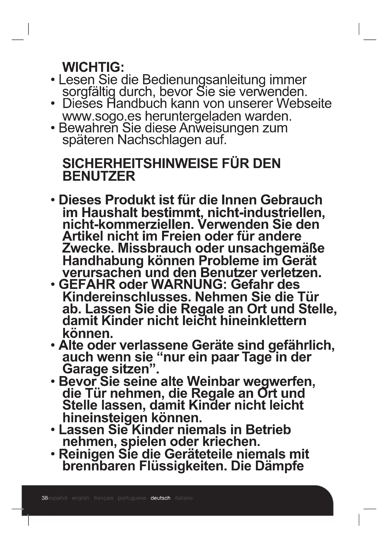 - Geräte können von Personen mit eingeschränkten physischen, sensorischen oder mentalen Fähigkeiten oder Mangel an Erfahrung und Wissen benutzt werden,42 español english français portuguese deutsch italiano wenn sie gegeben wurden Beaufsichtigung oder Anweisungen bezüglich des sicheren Gebrauchs des Geräts und kennen die Gefahren.