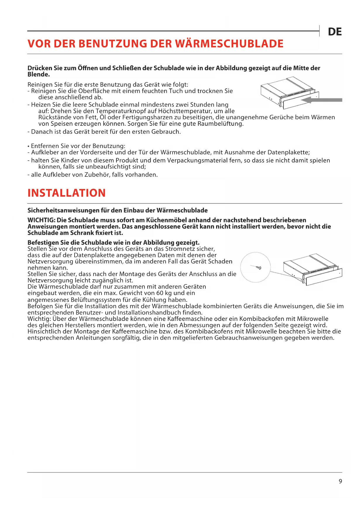 - Entfernen Sie vor der Benutzung: - Aufkleber an der Vorderseite und der Tür der Wärmeschublade, mit Ausnahme der Datenplakette; - halten Sie Kinder von diesem Produkt und dem Verpackungsmaterial fern, so dass sie nicht damit spielen können, falls sie unbeaufsichtigt sind; - alle Aufkleber von Zubehör, falls vorhanden. INSTALLATION Sicherheitsanweisungen für den Einbau der Wärmeschublade WICHTIG: Die Schublade muss sofort am Küchenmöbel anhand der nachstehend beschriebenen Anweisungen montiert werden. Das angeschlossene Gerät kann nicht installiert werden, bevor nicht die Schublade am Schrank xiert ist. Befestigen Sie die Schublade wie in der Abbildung gezeigt. Stellen Sie vor dem Anschluss des Geräts an das Stromnetz sicher, dass die auf der Datenplakette angegebenen Daten mit denen der Netzversorgung übereinstimmen, da im anderen Fall das Gerät Schaden nehmen kann. Stellen Sie sicher, dass nach der Montage des Geräts der Anschluss an die Netzversorgung leicht zugänglich ist. Die Wärmeschublade darf nur zusammen mit anderen Geräten eingebaut werden, die ein max. Gewicht von 60 kg und ein angemessenes Belüftungssystem für die Kühlung haben. Befolgen Sie für die Installation des mit der Wärmeschublade kombinierten Geräts die Anweisungen, die Sie im entsprechenden Benutzer- und Installationshandbuch finden. Wichtig: Über der Wärmeschublade können eine Kaffeemaschine oder ein Kombibackofen mit Mikrowelle des gleichen Herstellers montiert werden, wie in den Abmessungen auf der folgenden Seite gezeigt wird. Hinsichtlich der Montage der Kaffeemaschine bzw. des Kombibackofens mit Mikrowelle beachten Sie bitte die entsprechenden Anleitungen sorgfältig, die in den mitgelieferten Gebrauchsanweisungen gegeben werden.10 ÜBERSICHT