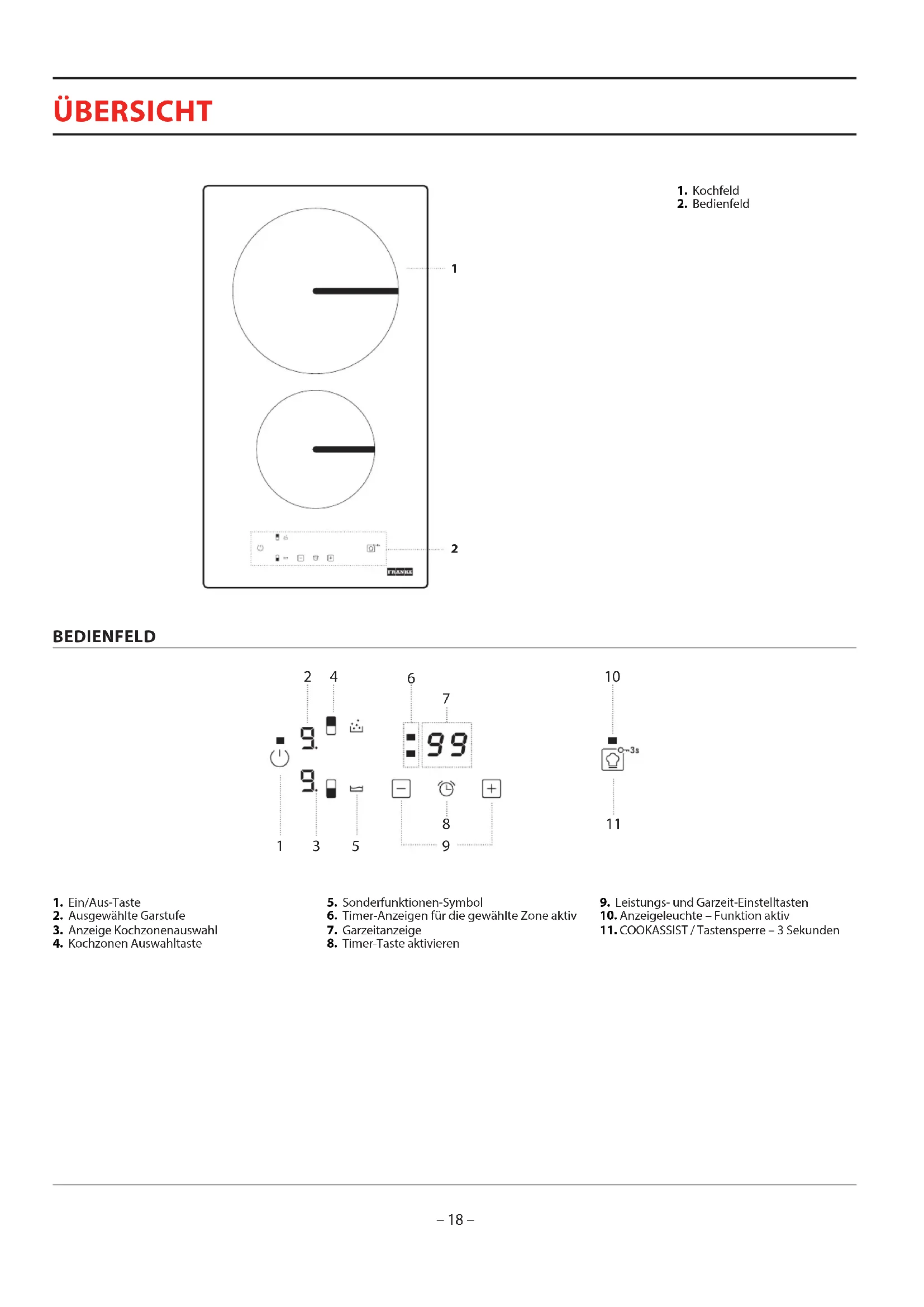 1. Ein/Aus-Taste2. Ausgewählte Garstufe3. Anzeige Kochzonenauswahl4. Kochzonen Auswahltaste5. Sonderfunktionen-Symbol6. Timer-Anzeigen für die gewählte Zone aktiv7. Garzeitanzeige8. Timer-Taste aktivieren9. Leistungs- und Garzeit-Einstelltasten10. Anzeigeleuchte – Funktion aktiv11. COOKASSIST / Tastensperre – 3 Sekunden