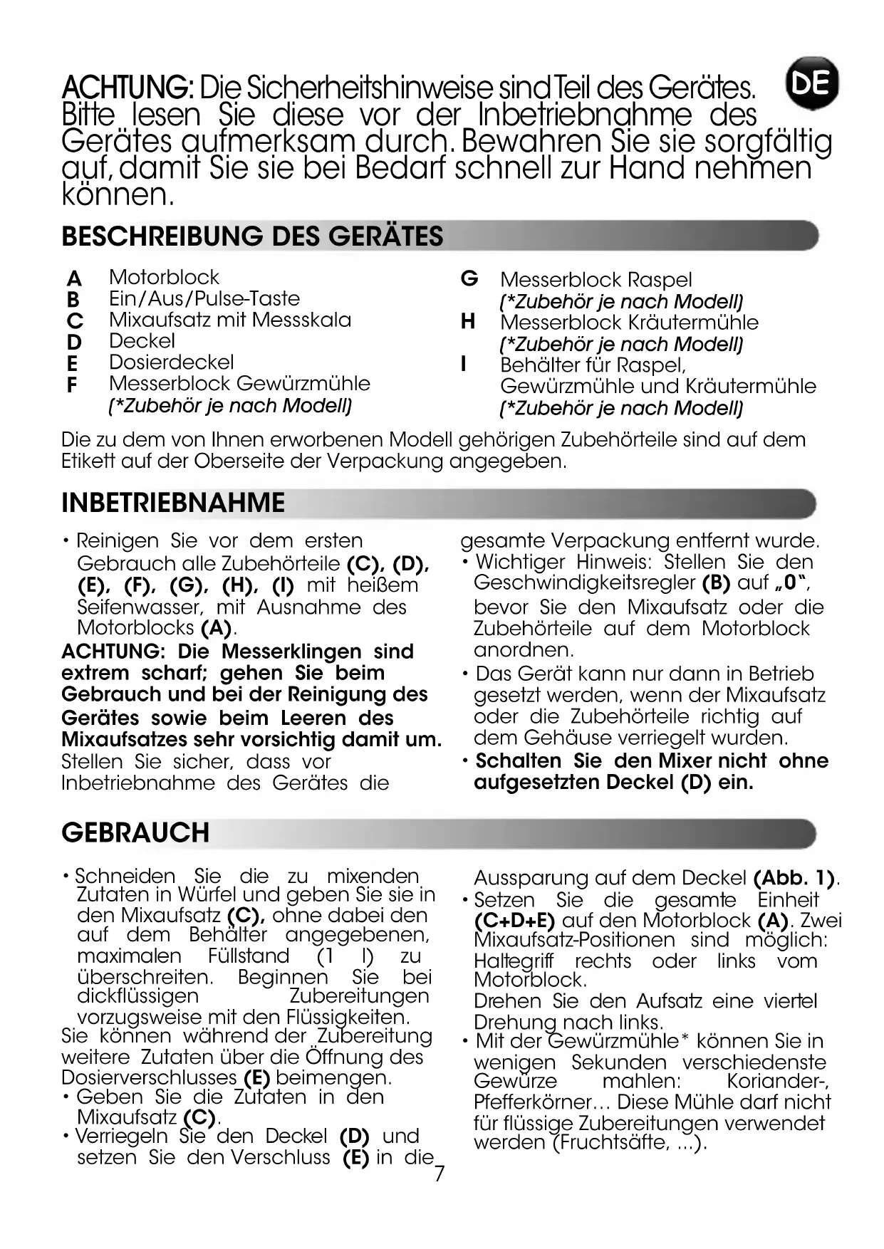 - Reinigen Sie vor dem ersten Gebrauch alle Zubehörteile (C), (D), (E), (F), (G), (H), (I) mit heißem Seifenwasser, mit Ausnahme des Motorblocks (A). ACHTUNG: Die Messerklingen sind extrem scharf; gehen Sie beim Gebrauch und bei der Reinigung des Gerätes sowie beim Leeren des Mixaufsatzes sehr vorsichtig damit um. Stellen Sie sicher, dass vor Inbetriebnahme des Gerätes die gesamte Verpackung entfernt wurde.