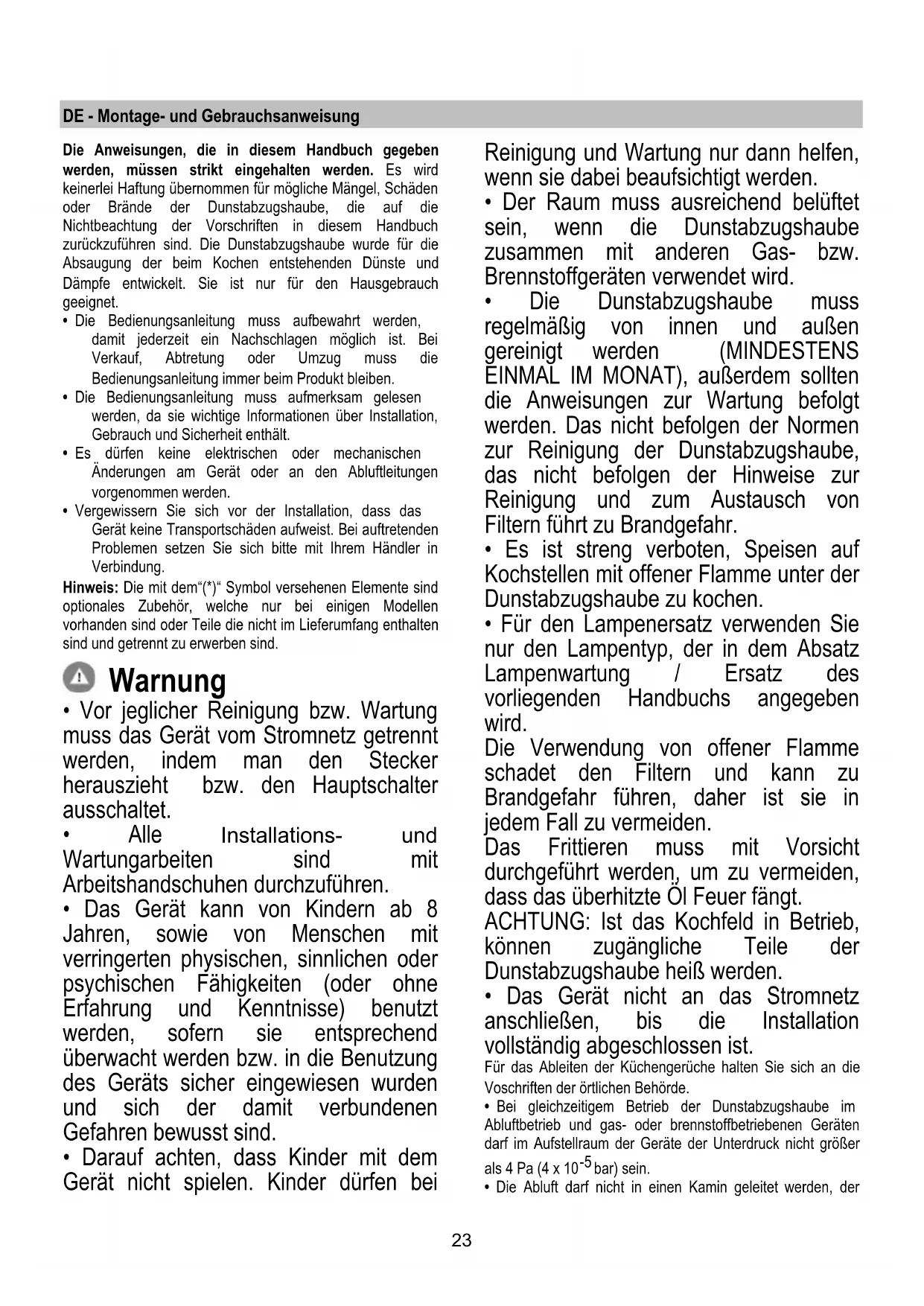 - Es ist streng verboten, Speisen auf Kochstellen mit offener Flamme unter der Dunstabzugshaube zu kochen.