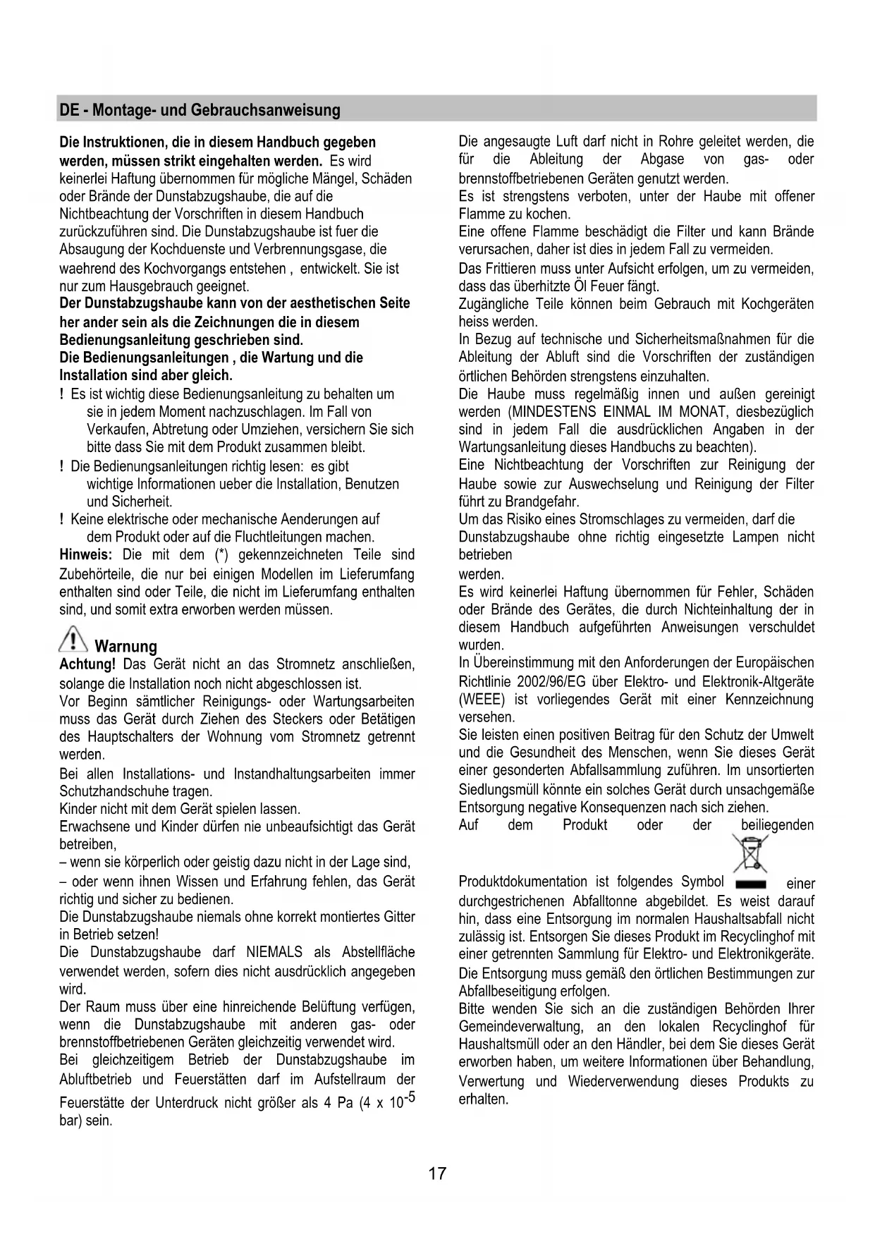 If the lights do not work, make sure that the lamps are fitted properly into their housings before you call for technical assistance.17 DE - Montage- und Gebrauchsanweisung Die Instruktionen, die in diesem Handbuch gegeben werden, müssen strikt eingehalten werden. Es wird keinerlei Haftung übernommen für mögliche Mängel, Schäden oder Brände der Dunstabzugshaube, die auf die Nichtbeachtung der Vorschriften in diesem Handbuch zurückzuführen sind. Die Dunstabzugshaube ist fuer die Absaugung der Kochduenste und Verbrennungsgase, die waehrend des Kochvorgangs entstehen , entwickelt. Sie ist nur zum Hausgebrauch geeignet. Der Dunstabzugshaube kann von der aesthetischen Seite her ander sein als die Zeichnungen die in diesem Bedienungsanleitung geschrieben sind. Die Bedienungsanleitungen , die Wartung und die Installation sind aber gleich. ! Es ist wichtig diese Bedienungsanleitung zu behalten um sie in jedem Moment nachzuschlagen. Im Fall von Verkaufen, Abtretung oder Umziehen, versichern Sie sich bitte dass Sie mit dem Produkt zusammen bleibt. ! Die Bedienungsanleitungen richtig lesen: es gibt wichtige Informationen ueber die Installation, Benutzen und Sicherheit. ! Keine elektrische oder mechanische Aenderungen auf dem Produkt oder auf die Fluchtleitungen machen. Hinweis: Die mit dem (*) gekennzeichneten Teile sind Zubehörteile, die nur bei einigen Modellen im Lieferumfang enthalten sind oder Teile, die nicht im Lieferumfang enthalten sind, und somit extra erworben werden müssen. Warnung Achtung! Das Gerät nicht an das Stromnetz anschließen, solange die Installation noch nicht abgeschlossen ist. Vor Beginn sämtlicher Reinigungs- oder Wartungsarbeiten muss das Gerät durch Ziehen des Steckers oder Betätigen des Hauptschalters der Wohnung vom Stromnetz getrennt werden. Bei allen Installations- und Instandhaltungsarbeiten immer Schutzhandschuhe tragen. Kinder nicht mit dem Gerät spielen lassen. Erwachsene und Kinder dürfen nie unbeaufsichtigt das Gerät betreiben, – wenn sie körperlich oder geistig dazu nicht in der Lage sind, – oder wenn ihnen Wissen und Erfahrung fehlen, das Gerät richtig und sicher zu bedienen. Die Dunstabzugshaube niemals ohne korrekt montiertes Gitter in Betrieb setzen! Die Dunstabzugshaube darf NIEMALS als Abstellfläche verwendet werden, sofern dies nicht ausdrücklich angegeben wird. Der Raum muss über eine hinreichende Belüftung verfügen, wenn die Dunstabzugshaube mit anderen gas- oder brennstoffbetriebenen Geräten gleichzeitig verwendet wird. Bei gleichzeitigem Betrieb der Dunstabzugshaube im Abluftbetrieb und Feuerstätten darf im Aufstellraum der Feuerstätte der Unterdruck nicht größer als 4 Pa (4 x 10