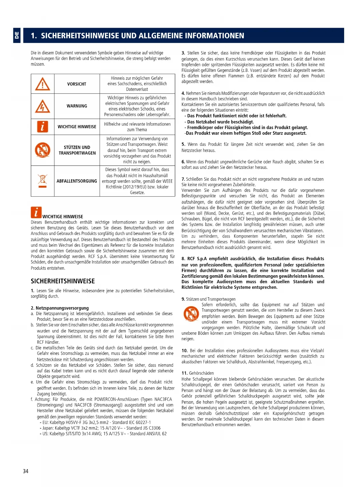 a. Die Netzspannung ist lebensgefährlich. Installieren und verbinden Sie dieses Produkt, bevor Sie es an eine Netzsteckdose anschließen. b. Stellen Sie vor dem Einschalten sicher, dass alle Anschlüsse korrekt vorgenommen wurden und die Netzspannung mit der auf dem Typenschild angegebenen Spannung übereinstimmt. Ist dies nicht der Fall, kontaktieren Sie bitte Ihren RCF Händler. c. Die metallischen Teile des Geräts sind durch das Netzkabel geerdet. Um die Gefahr eines Stromschlags zu vermeiden, muss das Netzkabel immer an eine Netzsteckdose mit Schutzerdung angeschlossen werden. d. Schützen sie das Netzkabel vor Schäden. Stellen Sie sicher, dass niemand auf das Kabel treten kann und es nicht durch darauf liegende oder stehende Objekte gequetscht wird. e. Um die Gefahr eines Stromschlags zu vermeiden, darf das Produkt nicht geöffnet werden. Es befinden sich im Inneren keine Teile, zu denen der Nutzer Zugang benötigt. f. Achtung: Für Produkte, die mit POWERCON-Anschlüssen (Typen NAC3FCA (Stromeingang) und NAC3FCB (Stromausgang)) ausgestattet sind und vom Hersteller ohne Netzkabel geliefert werden, müssen die folgenden Netzkabel gemäß den jeweiligen regionalen Standards verwendet werden: - EU: Kabeltyp H05VV-F 3G 3x2,5 mm2 - Standard IEC 60227-1 - Japan: Kabeltyp VCTF 3x2 mm2; 15 A/120 V~ - Standard JIS C3306 - US: Kabeltyp SJT/SJTO 3x14 AWG; 15 A/125 V~ - Standard ANSI/UL 62
