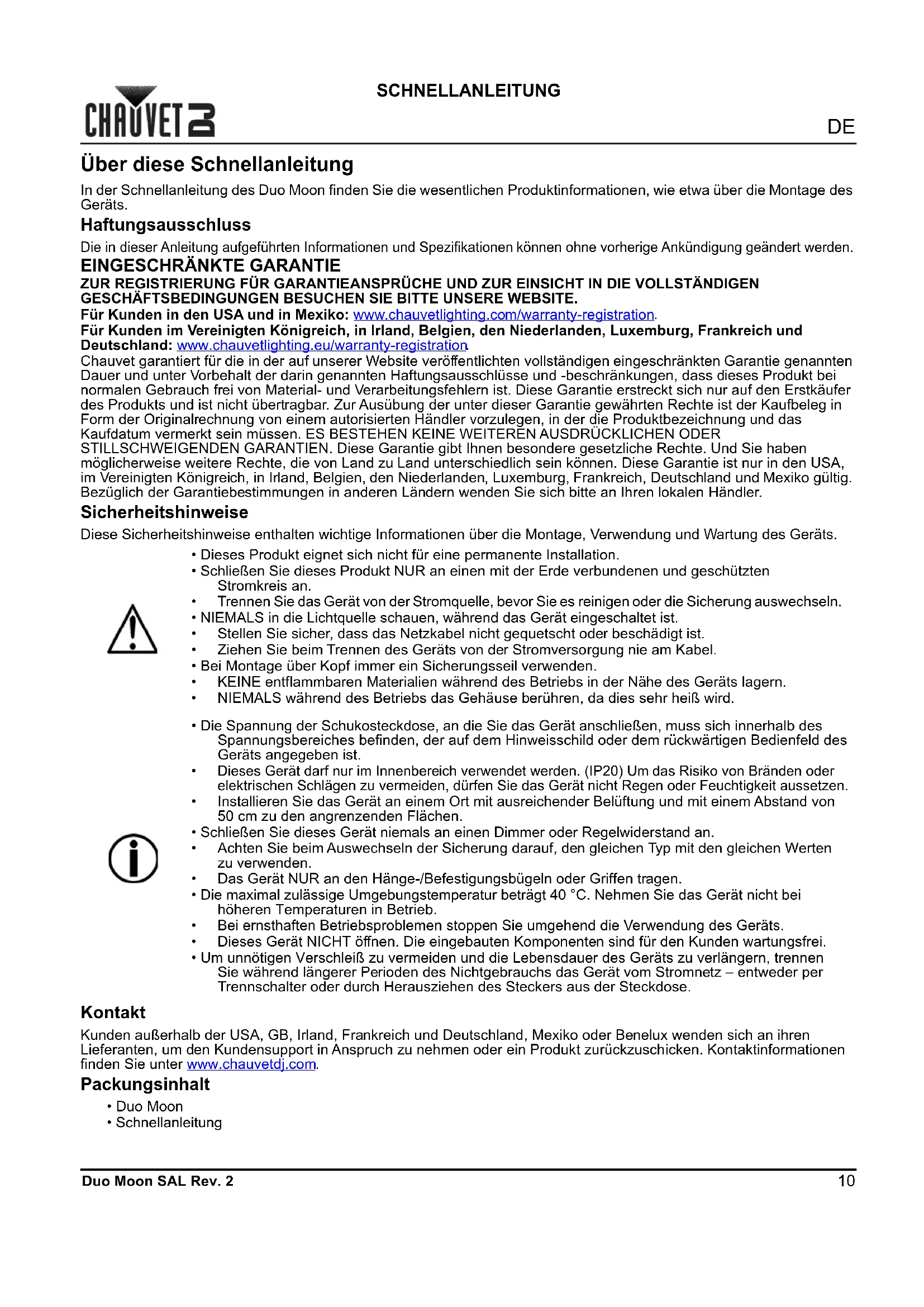 Chauvet garantiert für die in der auf unserer Website veröffentlichten vollständigen eingeschränkten Garantie genannten Dauer und unter Vorbehalt der darin genannten Haftungsausschlüsse und -beschränkungen, dass dieses Produkt bei normalen Gebrauch frei von Material- und Verarbeitungsfehlern ist. Diese Garantie erstreckt sich nur auf den Erstkäufer des Produkts und ist nicht übertragbar. Zur Ausübung der unter dieser Garantie gewährten Rechte ist der Kaufbeleg in Form der Originalrechnung von einem autorisierten Händler vorzulegen, in der die Produktbezeichnung und das Kaufdatum vermerkt sein müssen. ES BESTEHEN KEINE WEITEREN AUSDRÜCKLICHEN ODER STILLSCHWEIGENDEN GARANTIEN. Diese Garantie gibt Ihnen besondere gesetzliche Rechte. Und Sie haben möglicherweise weitere Rechte, die von Land zu Land unterschiedlich sein können. Diese Garantie ist nur in den USA, im Vereinigten Königreich, in Irland, Belgien, den Niederlanden, Luxemburg, Frankreich, Deutschland und Mexiko gültig. Bezüglich der Garantiebestimmungen in anderen Ländern wenden Sie sich bitte an Ihren lokalen Händler. Sicherheitshinweise Diese Sicherheitshinweise enthalten wichtige Informationen über die Montage, Verwendung und Wartung des Geräts. Kontakt Kunden außerhalb der USA, GB, Irland, Frankreich und Deutschland, Mexiko oder Benelux wenden sich an ihren Lieferanten, um den Kundensupport in Anspruch zu nehmen oder ein Produkt zurückzuschicken. Kontaktinformationen finden Sie unter www.chauvetdj.com