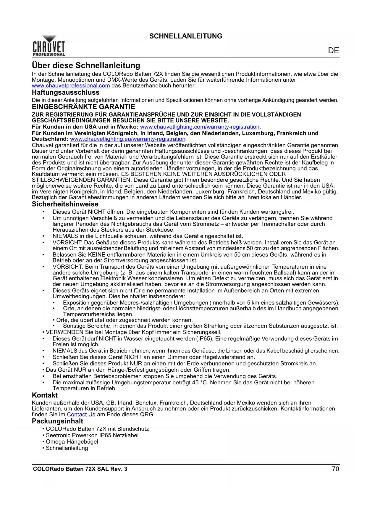 COLORado Batten 72X SAL Rev. 3 SCHNELLANLEITUNG Über diese Schnellanleitung In der Schnellanleitung des COLORado Batten 72X finden Sie die wesentlichen Produktinformationen, wie etwa über die Montage, Menüoptionen und DMX-Werte des Geräts. Laden Sie für weiterführende Informationen unter www.chauvetprofessional.com das Benutzerhandbuch herunter. Haftungsausschluss Die in dieser Anleitung aufgeführten Informationen und Spezifikationen können ohne vorherige Ankündigung geändert werden.