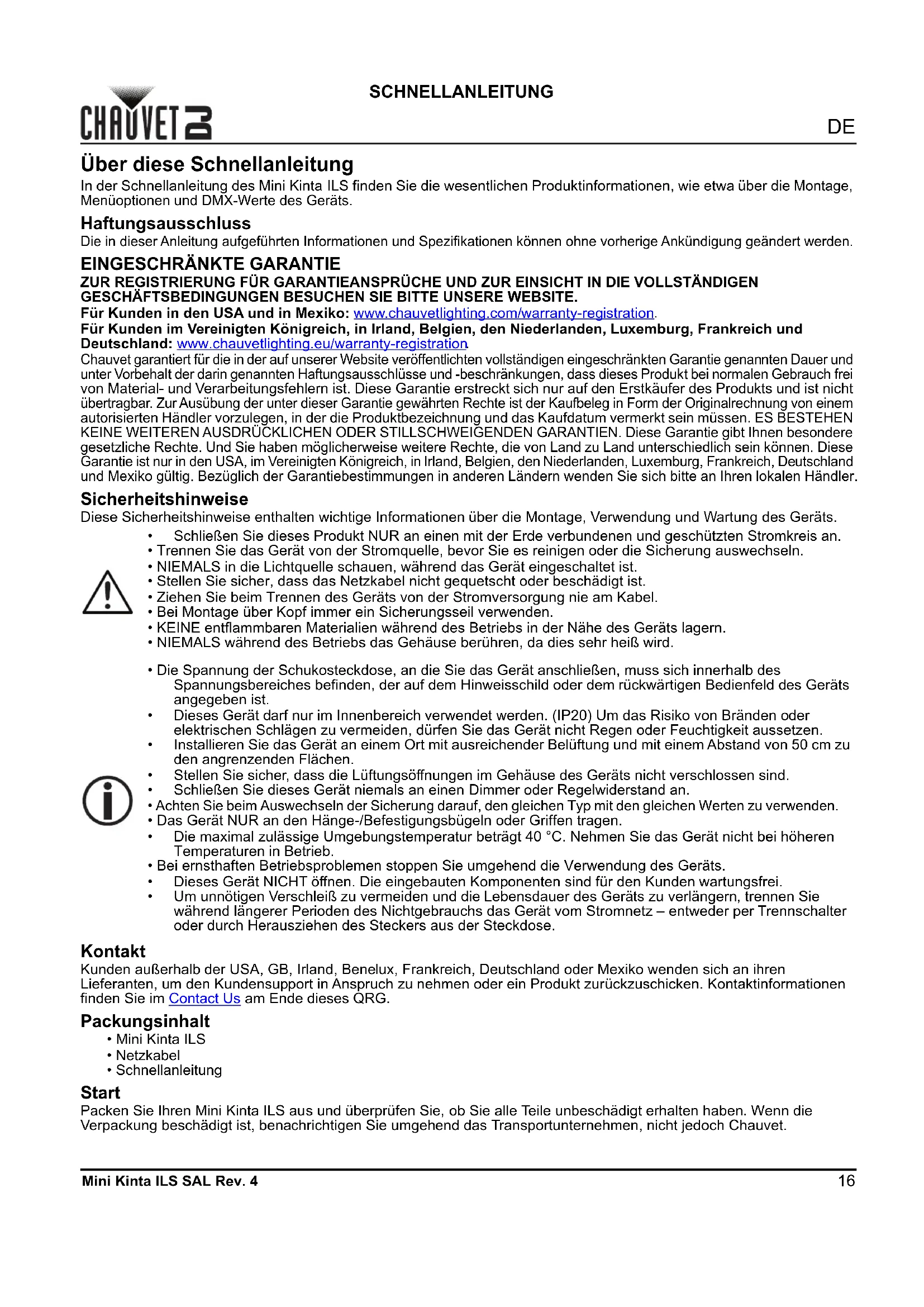Chauvet garantiert für die in der auf unserer Website veröffentlichten vollständigen eingeschränkten Garantie genannten Dauer und unter Vorbehalt der darin genannten Haftungsausschlüsse und -beschränkungen, dass dieses Produkt bei normalen Gebrauch frei von Material- und Verarbeitungsfehlern ist. Diese Garantie erstreckt sich nur auf den Erstkäufer des Produkts und ist nicht übertragbar. Zur Ausübung der unter dieser Garantie gewährten Rechte ist der Kaufbeleg in Form der Originalrechnung von einem autorisierten Händler vorzulegen, in der die Produktbezeichnung und das Kaufdatum vermerkt sein müssen. ES BESTEHEN KEINE WEITEREN AUSDRÜCKLICHEN ODER STILLSCHWEIGENDEN GARANTIEN. Diese Garantie gibt Ihnen besondere gesetzliche Rechte. Und Sie haben möglicherweise weitere Rechte, die von Land zu Land unterschiedlich sein können. Diese Garantie ist nur in den USA, im Vereinigten Königreich, in Irland, Belgien, den Niederlanden, Luxemburg, Frankreich, Deutschland und Mexiko gültig. Bezüglich der Garantiebestimmungen in anderen Ländern wenden Sie sich bitte an Ihren lokalen Händler. Sicherheitshinweise Diese Sicherheitshinweise enthalten wichtige Informationen über die Montage, Verwendung und Wartung des Geräts. Kontakt Kunden außerhalb der USA, GB, Irland, Benelux, Frankreich, Deutschland oder Mexiko wenden sich an ihren Lieferanten, um den Kundensupport in Anspruch zu nehmen oder ein Produkt zurückzuschicken. Kontaktinformationen finden Sie im Contact Us am Ende dieses QRG. Packungsinhalt Start Packen Sie Ihren Mini Kinta ILS aus und überprüfen Sie, ob Sie alle Teile unbeschädigt erhalten haben. Wenn die Verpackung beschädigt ist, benachrichtigen Sie umgehend das Transportunternehmen, nicht jedoch Chauvet.