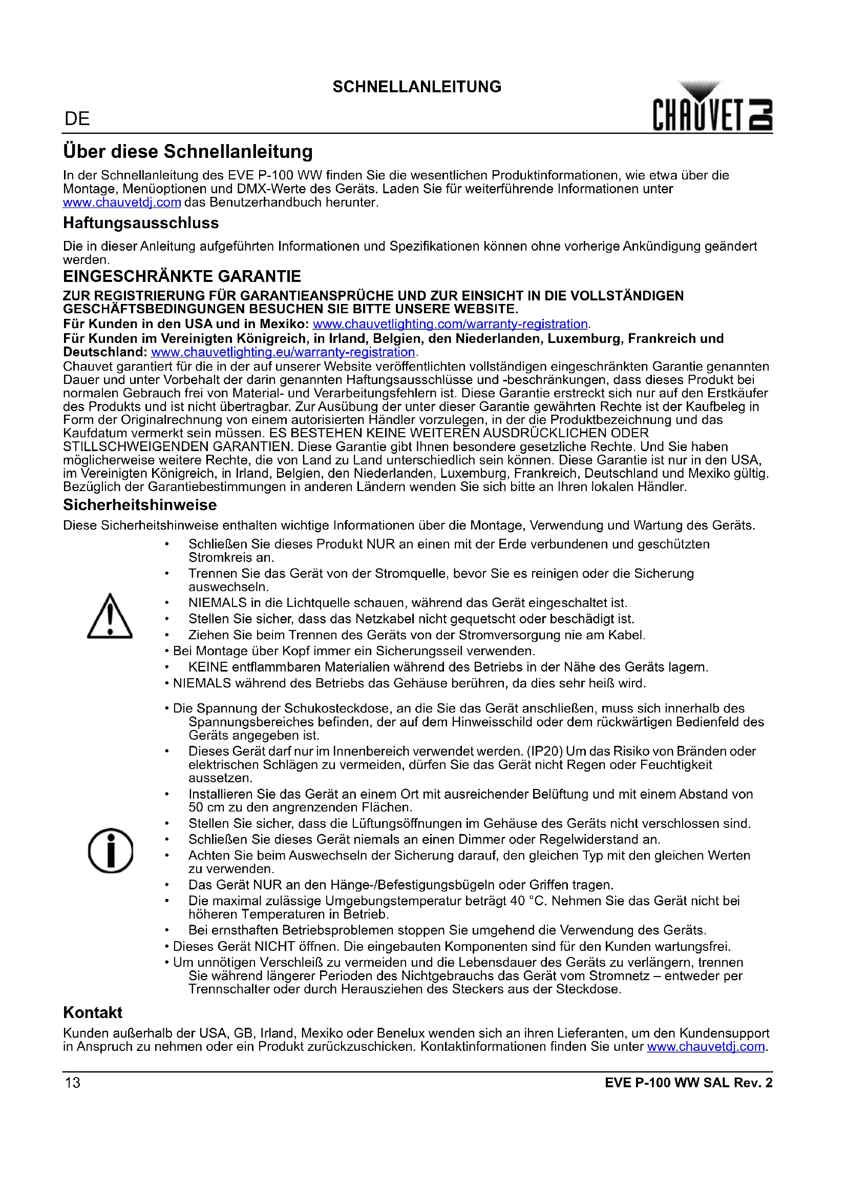 Chauvet garantiert für die in der auf unserer Website veröffentlichten vollständigen eingeschränkten Garantie genannten Dauer und unter Vorbehalt der darin genannten Haftungsausschlüsse und -beschränkungen, dass dieses Produkt bei normalen Gebrauch frei von Material- und Verarbeitungsfehlern ist. Diese Garantie erstreckt sich nur auf den Erstkäufer des Produkts und ist nicht übertragbar. Zur Ausübung der unter dieser Garantie gewährten Rechte ist der Kaufbeleg in Form der Originalrechnung von einem autorisierten Händler vorzulegen, in der die Produktbezeichnung und das Kaufdatum vermerkt sein müssen. ES BESTEHEN KEINE WEITEREN AUSDRÜCKLICHEN ODER STILLSCHWEIGENDEN GARANTIEN. Diese Garantie gibt Ihnen besondere gesetzliche Rechte. Und Sie haben möglicherweise weitere Rechte, die von Land zu Land unterschiedlich sein können. Diese Garantie ist nur in den USA, im Vereinigten Königreich, in Irland, Belgien, den Niederlanden, Luxemburg, Frankreich, Deutschland und Mexiko gültig. Bezüglich der Garantiebestimmungen in anderen Ländern wenden Sie sich bitte an Ihren lokalen Händler. Sicherheitshinweise Diese Sicherheitshinweise enthalten wichtige Informationen über die Montage, Verwendung und Wartung des Geräts. Kontakt Kunden außerhalb der USA, GB, Irland, Mexiko oder Benelux wenden sich an ihren Lieferanten, um den Kundensupport in Anspruch zu nehmen oder ein Produkt zurückzuschicken. Kontaktinformationen finden Sie unter www.chauvetdj.com