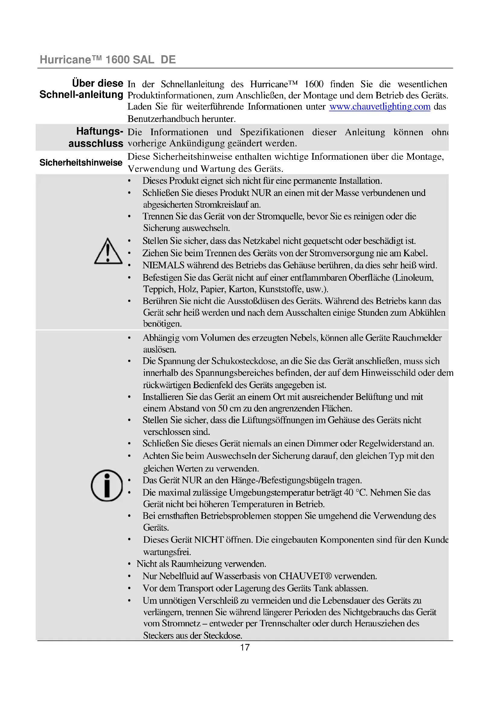 In der Schnellanleitung des Hurricane™ 1600 finden Sie die wesentlichen Produktinformationen, zum Anschließen, der Montage und dem Betrieb des Geräts. Laden Sie für weiterführende Informationen unter www.chauvetlighting.com das Benutzerhandbuch herunter. Haftungs- ausschluss Die Informationen und Spezifikationen dieser Anleitung können ohne vorherige Ankündigung geändert werden. Sicherheitshinweise Diese Sicherheitshinweise enthalten wichtige Informationen über die Montage, Verwendung und Wartung des Geräts.