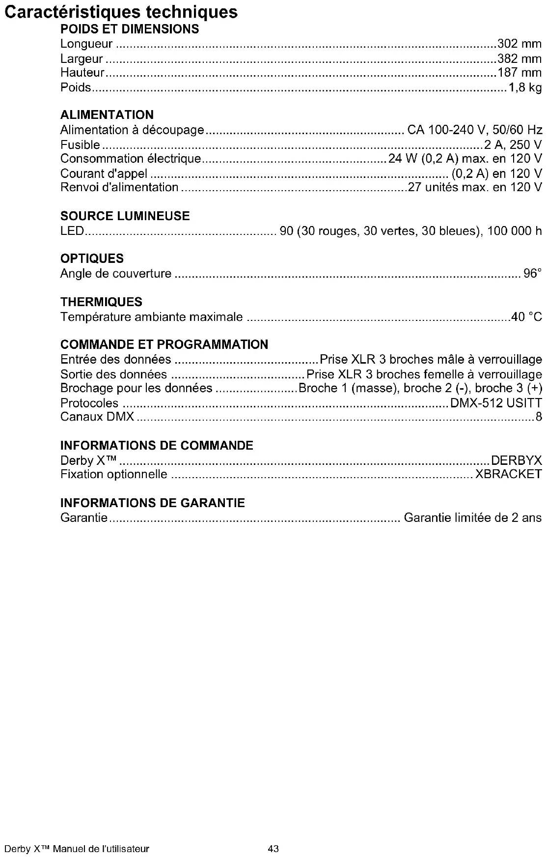 Schadensmeldung Bei etwaigen Transportschäden haftet das Transportunternehmen; daher ist bei Schäden unmittelbar nach Erhalt der Waren das Transportunternehmen darüber in Kenntnis zu setzen. Der Kunde ist bei etwaigen Transportschäden verantwortlich für die Schadensmeldung und die Geltendmachung von Schadensersatzforderungen gegenüber dem Transportunternehmen. Bei anderen Forderungen, wie z. B. bei fehlenden Komponenten oder Teilen, Schäden, die nicht durch den Transport entstanden sind, muss der Anspruch innerhalb von sieben (7) Tagen ab Erhalt der Waren geltend gemacht werden.Derby X™ Bedienungsanleitung 57 Technische Daten GEWICHT & ABMESSUNGEN Länge .................................................................................................................................... 11,9 in (302 mm) Breite ........................................................................................................................................ 15 in (382 mm) Höhe ....................................................................................................................................... 7,4 in (187 mm) Gewicht ....................................................................................................................................... 4 lbs (1,8 kg) LEISTUNGSAUFNAHME Vorschaltgerät, das automatisch die anliegende Spannung erkennt .......................... 100-240 VAC, 50/60 Hz Sicherung ....................................................................................................................................... F1A 250 V Leistungsaufnahme .............................................................................................. 24 V (0,2 A) max. bei 120 V Einschaltstrom ....................................................................................................................... (0,2 A) bei 120 V Leistungsabgabe ..................................................................................................... 27 Geräte max. bei 120 V LEUCHTQUELLE LED ....................................................................... 90 (30 rote, 30 grüne, 30 blaue) 100.000 Betriebsstunden FOTOOPTIK Abdeckungswinkel ..................................................................................................................................... 96° WÄRMEENTWICKLUNG Maximale Umgebungstemperatur ............................................................................................ 104 °F (40 °C)
