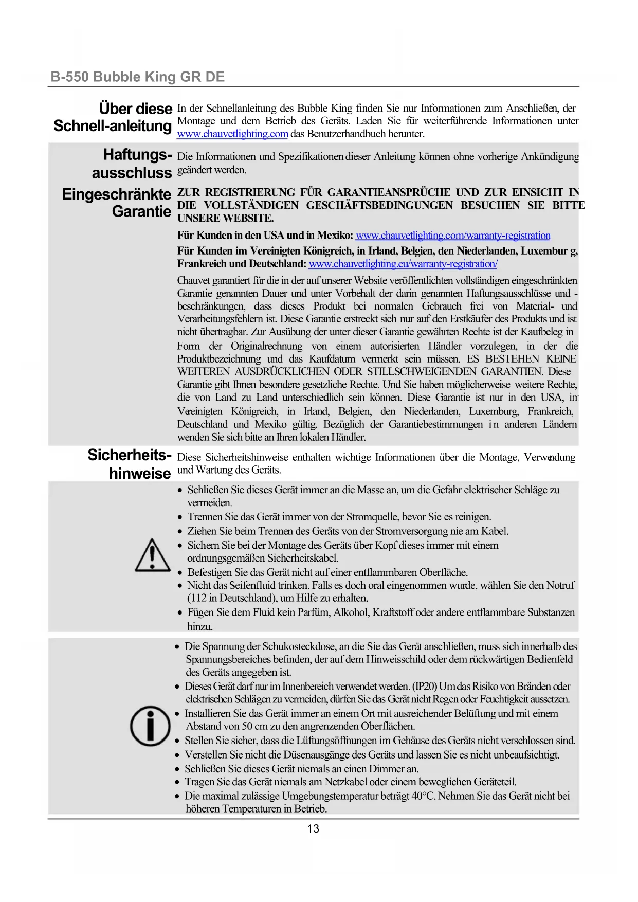 In der Schnellanleitung des Bubble King finden Sie nur Informationen zum Anschließe n, der Montage und dem Betrieb des Geräts. Laden Sie für weiterführende Informationen unter www.chauvetlighting.com das Benutzerhandbuch herunter. Haftungs- ausschluss Die Informationen und Spezifikationen dieser Anleitung können ohne vorherige Ankündigung geändert werden. Eingeschränkte Garantie