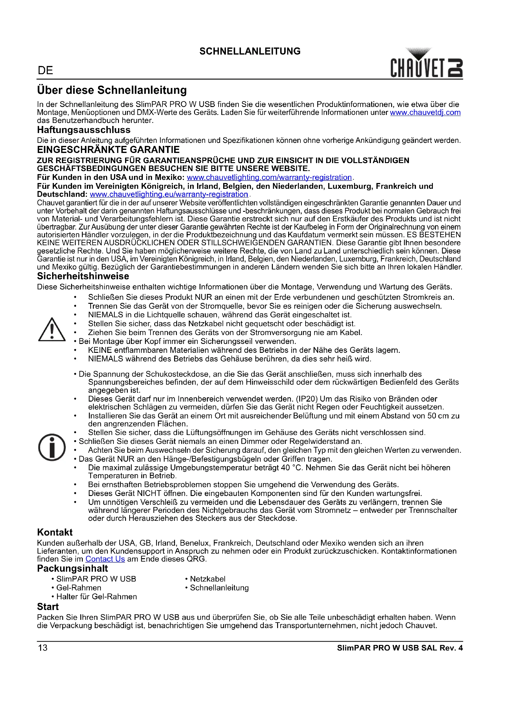 Chauvet garantiert für die in der auf unserer Website veröffentlichten vollständigen eingeschränkten Garantie genannten Dauer und unter Vorbehalt der darin genannten Haftungsausschlüsse und -beschränkungen, dass dieses Produkt bei normalen Gebrauch frei von Material- und Verarbeitungsfehlern ist. Diese Garantie erstreckt sich nur auf den Erstkäufer des Produkts und ist nicht übertragbar. Zur Ausübung der unter dieser Garantie gewährten Rechte ist der Kaufbeleg in Form der Originalrechnung von einem autorisierten Händler vorzulegen, in der die Produktbezeichnung und das Kaufdatum vermerkt sein müssen. ES BESTEHEN KEINE WEITEREN AUSDRÜCKLICHEN ODER STILLSCHWEIGENDEN GARANTIEN. Diese Garantie gibt Ihnen besondere gesetzliche Rechte. Und Sie haben möglicherweise weitere Rechte, die von Land zu Land unterschiedlich sein können. Diese Garantie ist nur in den USA, im Vereinigten Königreich, in Irland, Belgien, den Niederlanden, Luxemburg, Frankreich, Deutschland und Mexiko gültig. Bezüglich der Garantiebestimmungen in anderen Ländern wenden Sie sich bitte an Ihren lokalen Händler. Sicherheitshinweise Diese Sicherheitshinweise enthalten wichtige Informationen über die Montage, Verwendung und Wartung des Geräts. Kontakt Kunden außerhalb der USA, GB, Irland, Benelux, Frankreich, Deutschland oder Mexiko wenden sich an ihren Lieferanten, um den Kundensupport in Anspruch zu nehmen oder ein Produkt zurückzuschicken. Kontaktinformationen finden Sie im Contact Us am Ende dieses QRG. Packungsinhalt Start Packen Sie Ihren SlimPAR PRO W USB aus und überprüfen Sie, ob Sie alle Teile unbeschädigt erhalten haben. Wenn die Verpackung beschädigt ist, benachrichtigen Sie umgehend das Transportunternehmen, nicht jedoch Chauvet.