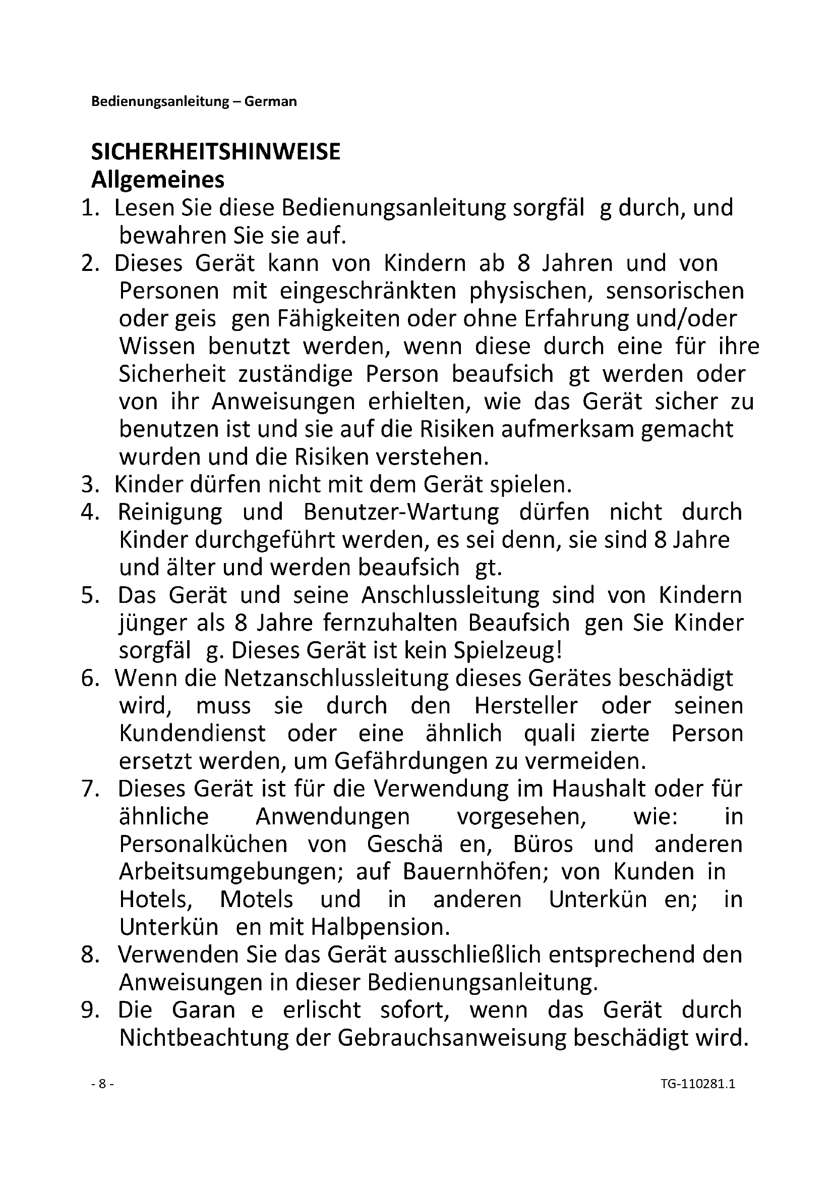 einer Störung während des Betriebes; vor jeder Reinigung.- 11 - TG-110281.1 Ziehen Sie den Netzstecker aus der Steckdose, wenn das Gerät nicht in Gebrauch ist und vor der Reinigung.
