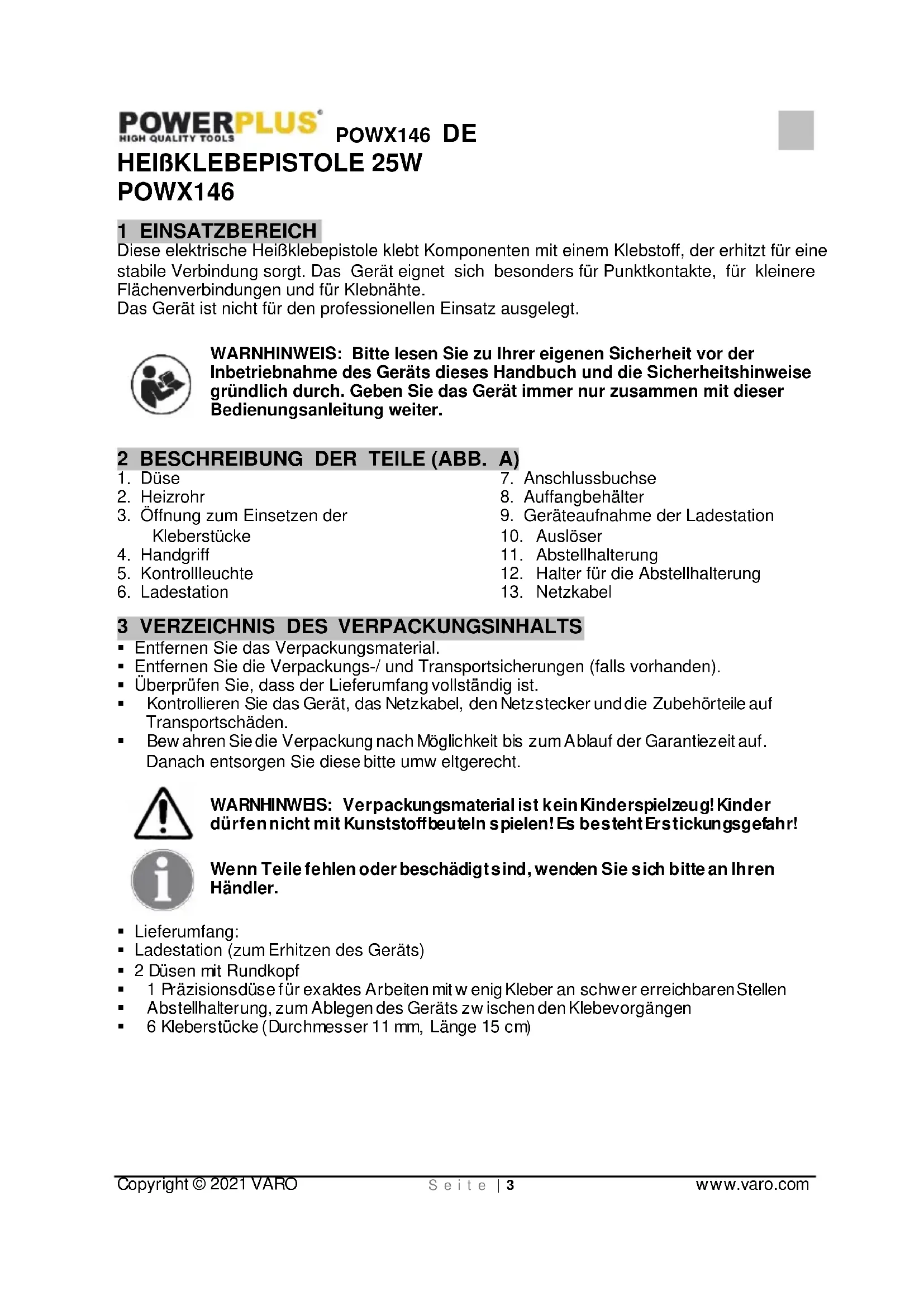 Entfernen Sie das Verpackungsmaterial. Entfernen Sie die Verpackungs-/ und Transportsicherungen (falls vorhanden). Überprüfen Sie, dass der Lieferumfang vollständig ist. Kontrollieren Sie das Gerät, das Netzkabel, den Netzstecker und die Zubehörteile auf Transportschäden. Bew ahren Sie die Verpackung nach Möglichkeit bis zum Ablauf der Garantiezeit auf. Danach entsorgen Sie diese bitte umw eltgerecht. WARNHINWEIS: Verpackungsmaterial ist kein Kinderspielzeug! Kinder dürfen nicht mit Kunststoffbeuteln spielen! Es besteht Erstickungsgefahr! Wenn Teile fehlen oder beschädigt sind, wenden Sie sich bitte an Ihren Händler. Lieferumfang: Ladestation (zum Erhitzen des Geräts) 2 Düsen mit Rundkopf 1 Präzisionsdüse für exaktes Arbeiten mit w enig Kleber an schwer erreichbaren Stellen Abstellhalterung, zum Ablegen des Geräts zw ischen den Klebevorgängen 6 Kleberstücke (Durchmesser 11 mm, Länge 15 cm)POWX146 DE Copyright © 2021 VARO S e i t e | 4 www.varo.com