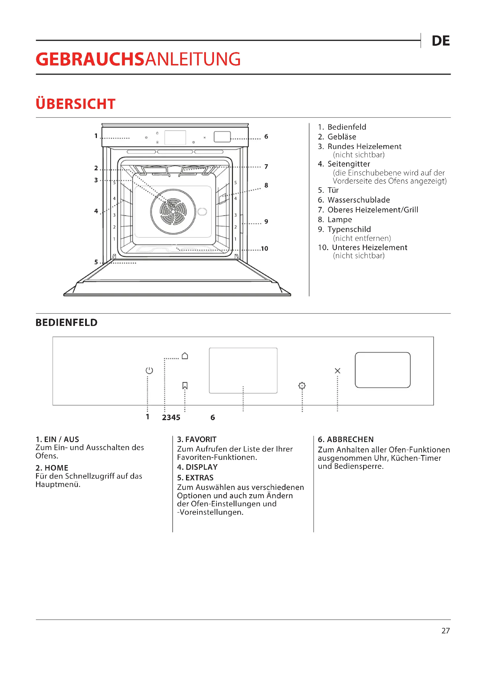1 Bedienfeld2 Gebläse3 Rundes Heizelement (nicht sichtbar)4 Seitengitter (die Einschubebene wird auf der Vorderseite des Ofens angezeigt)5 Tür6 Wasserschublade7 Oberes Heizelement/Grill8 Lampe9 Typenschild (nicht entfernen)10 Unteres Heizelement (nicht sichtbar)1. EIN / AUSZum Ein- und Ausschalten des Ofens2. HOMEFür den Schnellzugriff auf das Hauptmenü3. FAVORITZum Aufrufen der Liste der Ihrer Favoriten-Funktionen4. DISPLAY5. EXTRASZum Auswählen aus verschiedenen Optionen und auch zum Ändern der Ofen-Einstellungen und -Voreinstellungen6. ABBRECHENZum Anhalten aller Ofen-Funktionen ausgenommen Uhr, Küchen-Timer und Bediensperre