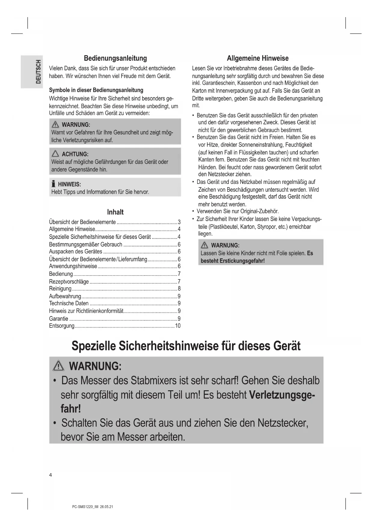 - Das Motorgehäuse ist nicht dazu bestimmt, bei der Reinigung in Wasser eingetaucht zu werden. Beachten Sie die Anweisungen, die wir Ihnen im Kapitel „Reinigung“ dazu geben.6 PC-SMS1220_IM 26.05.21 WARNUNG: