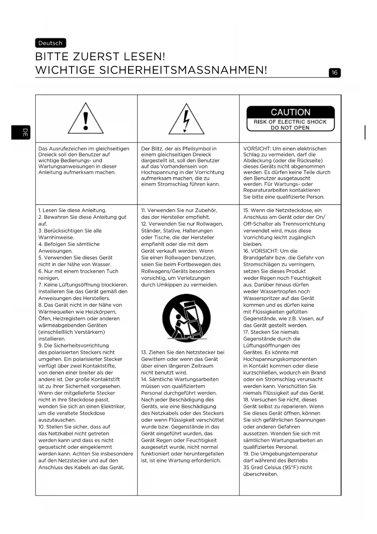 müssen von qualifiziertem Personal durchgeführt werden. Nach jeder Beschädigung des Geräts, wie eine Beschädigung des Netzkabels oder des Steckers oder wenn Flüssigkeit verschüttet wurde bzw. Gegenstände in das Gerät eingeführt wurden, das Gerät Regen oder Feuchtigkeit ausgesetzt wurde, nicht normal funktioniert oder heruntergefallen ist, ist eine Wartung erforderlich.
