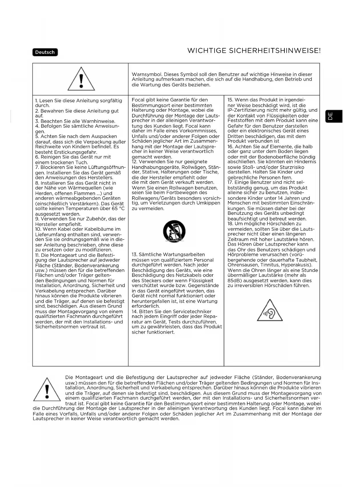 vermeiden, sollten Sie über die Lauts- precher nicht über einen längeren Zeitraum mit hoher Lautstärke hören. Das Hören über Lautsprecher kann das Ohr des Benutzers schädigen und Hörprobleme verursachen (vorü- bergehende oder dauerhafte Taubheit, Ohrensausen, Tinnitus, Hyperakusis). Wenn die Ohren länger als eine Stunde übermäßiger Lautstärke (mehr als 85dB) ausgesetzt werden, kann dies zu irreversiblen Hörschäden führen. Die Montageart und die Befestigung der Lautsprecher auf jedweder Fläche (Ständer, Bodenverankerung usw.) müssen den für die betreenden Flächen und/oder Träger geltenden Bedingungen und Normen für Ins- tallation, Anordnung, Sicherheit und Verkabelung entsprechen. Darüber hinaus können die Produkte vibrieren und die Träger, auf denen sie befestigt sind, beschädigen. Aus diesem Grund muss der Montagevorgang von einem qualifizierten Fachmann durchgeführt werden, der mit den Installations- und Sicherheitsnormen ver- traut ist. Focal gibt keine Garantie für den Bestimmungsort einer bestimmten Halterung oder Montage, wobei die Durchführung der Montage der Lautsprecher in der alleinigen Verantwortung des Kunden liegt. Focal kann daher im Falle eines Vorfalls, Unfalls und/oder anderer Folgen oder Schäden jeglicher Art im Zusammenhang mit der Montage der Lautsprecher in keiner Weise verantwortlich gemacht werden.DE