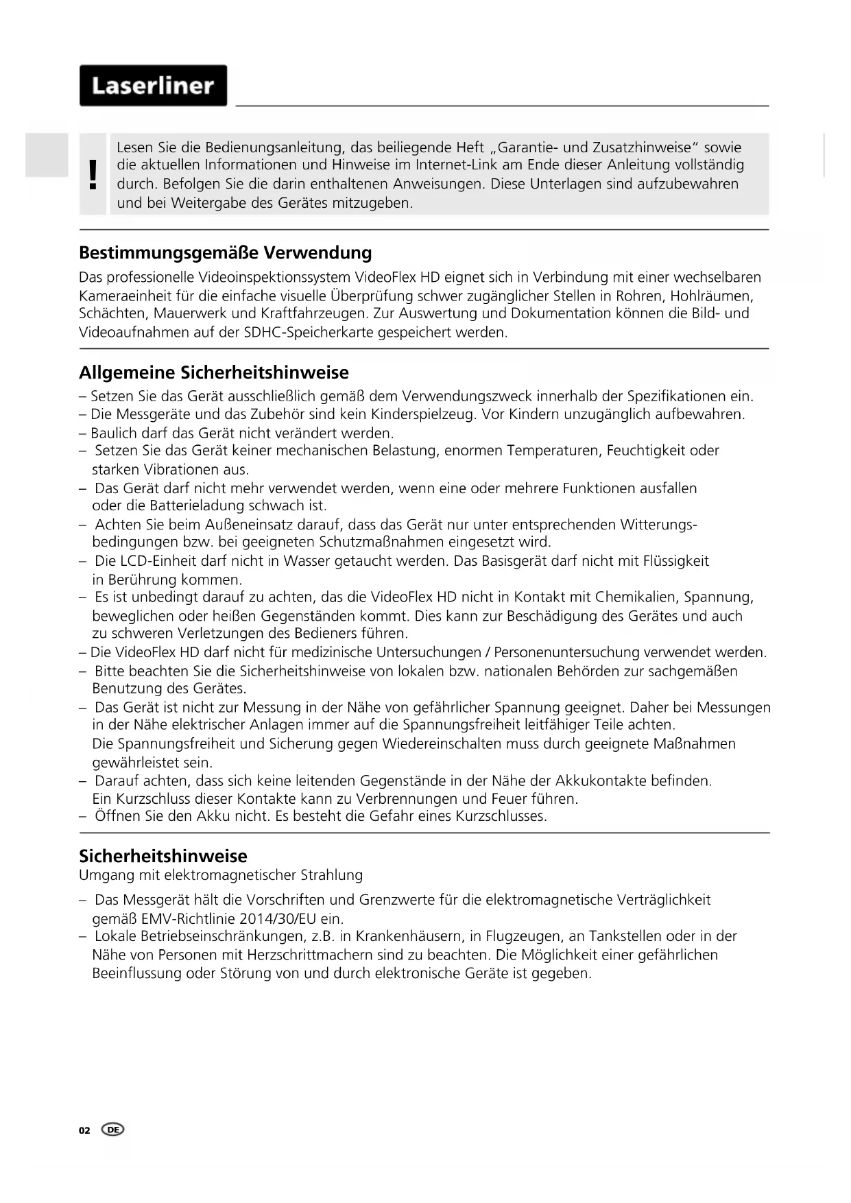 Bestimmungsgemäße Verwendung Das professionelle Videoinspektionssystem VideoFlex HD eignet sich in Verbindung mit einer wechselbaren Kameraeinheit für die einfache visuelle Überprüfung schwer zugänglicher Stellen in Rohren, Hohlräumen, Schächten, Mauerwerk und Kraftfahrzeugen. Zur Auswertung und Dokumentation können die Bild- und Videoaufnahmen auf der SDHC-Speicherkarte gespeichert werden. Allgemeine Sicherheitshinweise – Setzen Sie das Gerät ausschließlich gemäß dem Verwendungszweck innerhalb der Spezikationen ein. – Die Messgeräte und das Zubehör sind kein Kinderspielzeug. Vor Kindern unzugänglich aufbewahren. – Baulich darf das Gerät nicht verändert werden. – Setzen Sie das Gerät keiner mechanischen Belastung, enormen Temperaturen, Feuchtigkeit oder starken Vibrationen aus. – Das Gerät darf nicht mehr verwendet werden, wenn eine oder mehrere Funktionen ausfallen oder die Batterieladung schwach ist. – Achten Sie beim Außeneinsatz darauf, dass das Gerät nur unter entsprechenden Witterungs- bedingungen bzw. bei geeigneten Schutzmaßnahmen eingesetzt wird. – Die LCD-Einheit darf nicht in Wasser getaucht werden. Das Basisgerät darf nicht mit Flüssigkeit in Berührung kommen. – Es ist unbedingt darauf zu achten, das die VideoFlex HD nicht in Kontakt mit Chemikalien, Spannung, beweglichen oder heißen Gegenständen kommt. Dies kann zur Beschädigung des Gerätes und auch zu schweren Verletzungen des Bedieners führen. – Die VideoFlex HD darf nicht für medizinische Untersuchungen / Personenuntersuchung verwendet werden. – Bitte beachten Sie die Sicherheitshinweise von lokalen bzw. nationalen Behörden zur sachgemäßen Benutzung des Gerätes. – Das Gerät ist nicht zur Messung in der Nähe von gefährlicher Spannung geeignet. Daher bei Messungen in der Nähe elektrischer Anlagen immer auf die Spannungsfreiheit leitfähiger Teile achten. Die Spannungsfreiheit und Sicherung gegen Wiedereinschalten muss durch geeignete Maßnahmen gewährleistet sein. – Darauf achten, dass sich keine leitenden Gegenstände in der Nähe der Akkukontakte benden. Ein Kurzschluss dieser Kontakte kann zu Verbrennungen und Feuer führen. – Öffnen Sie den Akku nicht. Es besteht die Gefahr eines Kurzschlusses. Sicherheitshinweise Umgang mit elektromagnetischer Strahlung – Das Messgerät hält die Vorschriften und Grenzwerte für die elektromagnetische Verträglichkeit gemäß EMV-Richtlinie 2014/30/EU ein. – Lokale Betriebseinschränkungen, z.B. in Krankenhäusern, in Flugzeugen, an Tankstellen oder in der Nähe von Personen mit Herzschrittmachern sind zu beachten. Die Möglichkeit einer gefährlichen Beeinussung oder Störung von und durch elektronische Geräte ist gegeben. Lesen Sie die Bedienungsanleitung, das beiliegende Heft „Garantie- und Zusatzhinweise“ sowie die aktuellen Informationen und Hinweise im Internet-Link am Ende dieser Anleitung vollständig durch. Befolgen Sie die darin enthaltenen Anweisungen. Diese Unterlagen sind aufzubewahren und bei Weitergabe des Gerätes mitzugeben. !VideoFlex HD