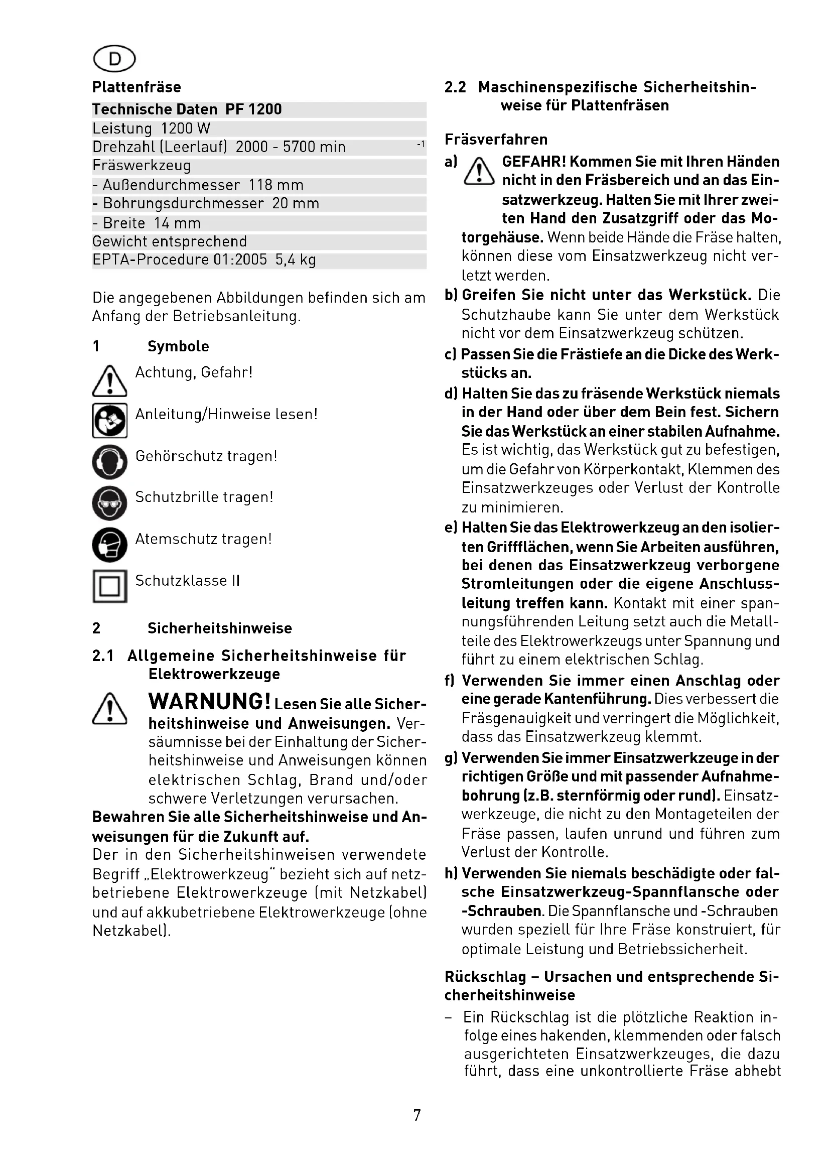 Fräswerkzeug - Außendurchmesser 118 mm - Bohrungsdurchmesser 20 mm - Breite 14 mm Gewicht entsprechend EPTA-Procedure 01:2005 5,4 kg Die angegebenen Abbildungen befinden sich am Anfang der Betriebsanleitung. 1 Symbole Achtung, Gefahr! Anleitung/Hinweise lesen! Gehörschutz tragen! Schutzbrille tragen! Atemschutz tragen! Schutzklasse II 2 Sicherheitshinweise