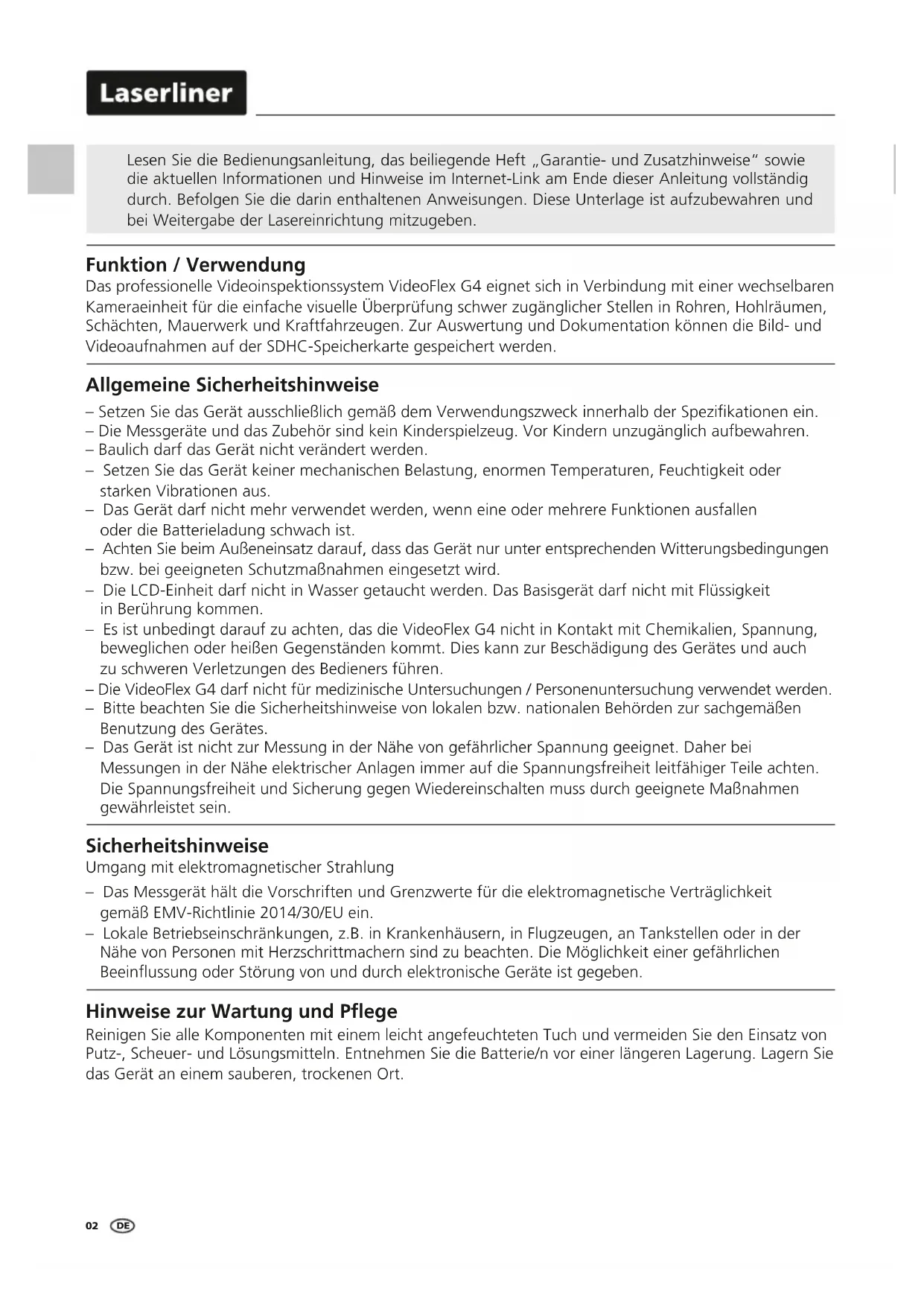 Lesen Sie die Bedienungsanleitung, das beiliegende Heft „Garantie- und Zusatzhinweise“ sowie die aktuellen Informationen und Hinweise im Internet-Link am Ende dieser Anleitung vollständig durch. Befolgen Sie die darin enthaltenen Anweisungen. Diese Unterlage ist aufzubewahren und bei Weitergabe der Lasereinrichtung mitzugeben. Funktion / Verwendung Das professionelle Videoinspektionssystem VideoFlex G4 eignet sich in Verbindung mit einer wechselbaren Kameraeinheit für die einfache visuelle Überprüfung schwer zugänglicher Stellen in Rohren, Hohlräumen, Schächten, Mauerwerk und Kraftfahrzeugen. Zur Auswertung und Dokumentation können die Bild- und Videoaufnahmen auf der SDHC-Speicherkarte gespeichert werden. Allgemeine Sicherheitshinweise – Setzen Sie das Gerät ausschließlich gemäß dem Verwendungszweck innerhalb der Spezikationen ein. – Die Messgeräte und das Zubehör sind kein Kinderspielzeug. Vor Kindern unzugänglich aufbewahren. – Baulich darf das Gerät nicht verändert werden. – Setzen Sie das Gerät keiner mechanischen Belastung, enormen Temperaturen, Feuchtigkeit oder starken Vibrationen aus. – Das Gerät darf nicht mehr verwendet werden, wenn eine oder mehrere Funktionen ausfallen oder die Batterieladung schwach ist. – Achten Sie beim Außeneinsatz darauf, dass das Gerät nur unter entsprechenden Witterungsbedingungen bzw. bei geeigneten Schutzmaßnahmen eingesetzt wird. – Die LCD-Einheit darf nicht in Wasser getaucht werden. Das Basisgerät darf nicht mit Flüssigkeit in Berührung kommen. – Es ist unbedingt darauf zu achten, das die VideoFlex G4 nicht in Kontakt mit Chemikalien, Spannung, beweglichen oder heißen Gegenständen kommt. Dies kann zur Beschädigung des Gerätes und auch zu schweren Verletzungen des Bedieners führen. – Die VideoFlex G4 darf nicht für medizinische Untersuchungen / Personenuntersuchung verwendet werden. – Bitte beachten Sie die Sicherheitshinweise von lokalen bzw. nationalen Behörden zur sachgemäßen Benutzung des Gerätes. – Das Gerät ist nicht zur Messung in der Nähe von gefährlicher Spannung geeignet. Daher bei Messungen in der Nähe elektrischer Anlagen immer auf die Spannungsfreiheit leitfähiger Teile achten. Die Spannungsfreiheit und Sicherung gegen Wiedereinschalten muss durch geeignete Maßnahmen gewährleistet sein. Sicherheitshinweise Umgang mit elektromagnetischer Strahlung – Das Messgerät hält die Vorschriften und Grenzwerte für die elektromagnetische Verträglichkeit gemäß EMV-Richtlinie 2014/30/EU ein. – Lokale Betriebseinschränkungen, z.B. in Krankenhäusern, in Flugzeugen, an Tankstellen oder in der Nähe von Personen mit Herzschrittmachern sind zu beachten. Die Möglichkeit einer gefährlichen Beeinussung oder Störung von und durch elektronische Geräte ist gegeben. Hinweise zur Wartung und Pege Reinigen Sie alle Komponenten mit einem leicht angefeuchteten Tuch und vermeiden Sie den Einsatz von Putz-, Scheuer- und Lösungsmitteln. Entnehmen Sie die Batterie/n vor einer längeren Lagerung. Lagern Sie das Gerät an einem sauberen, trockenen Ort. DEVideoFlex G4